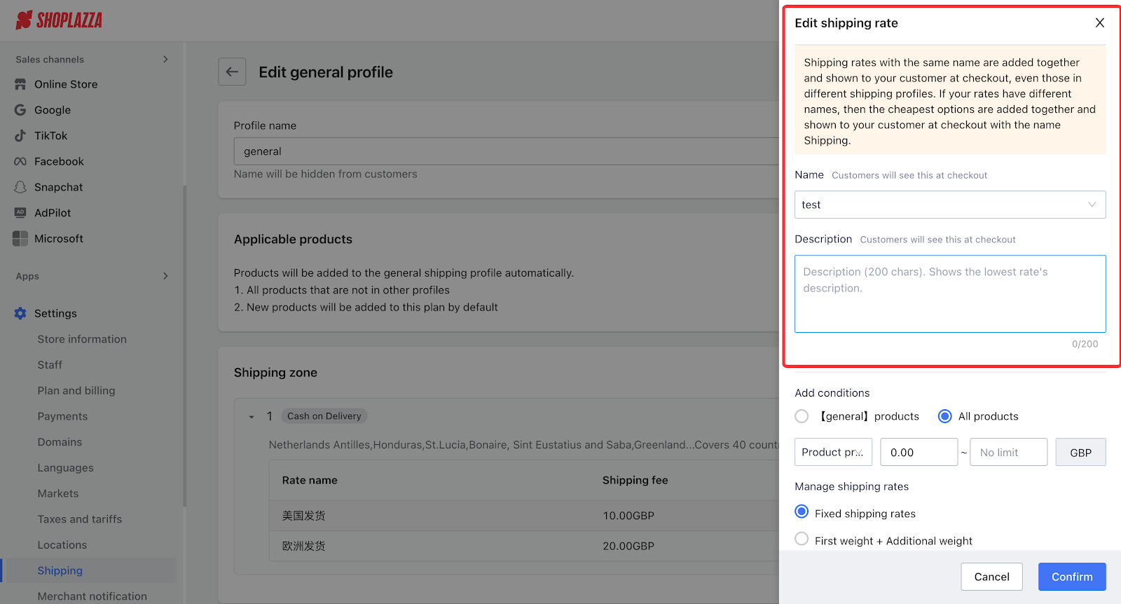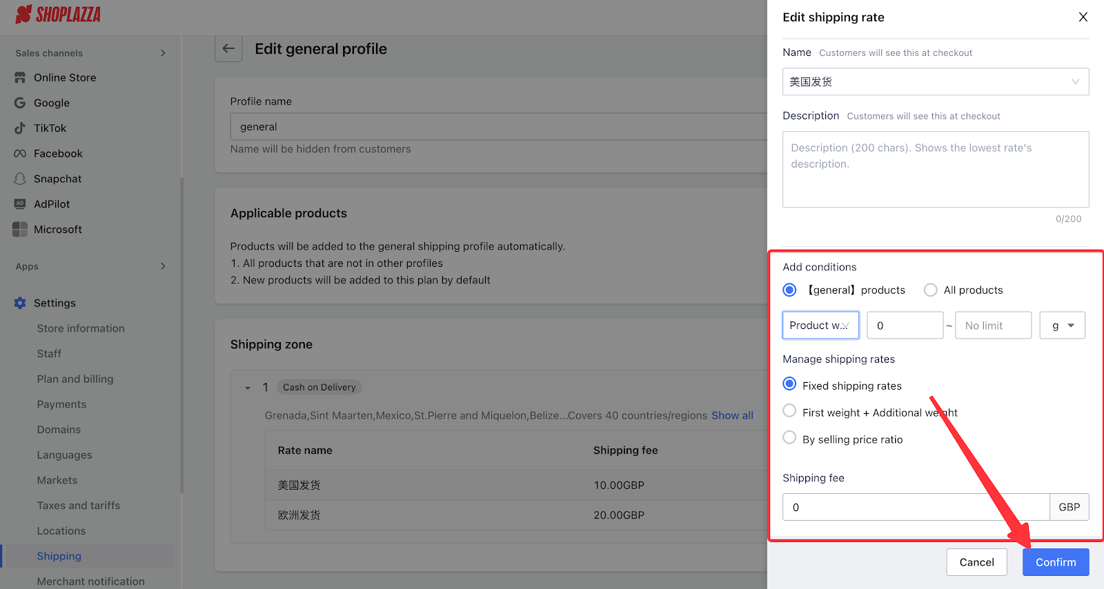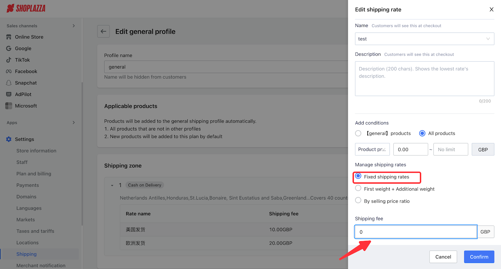 6. Set the shipping rate to Flat rate, enter 0 in the shipping fee field, and then click Confirm.