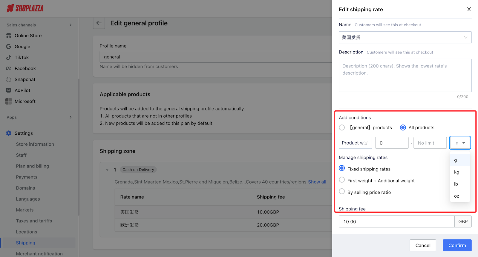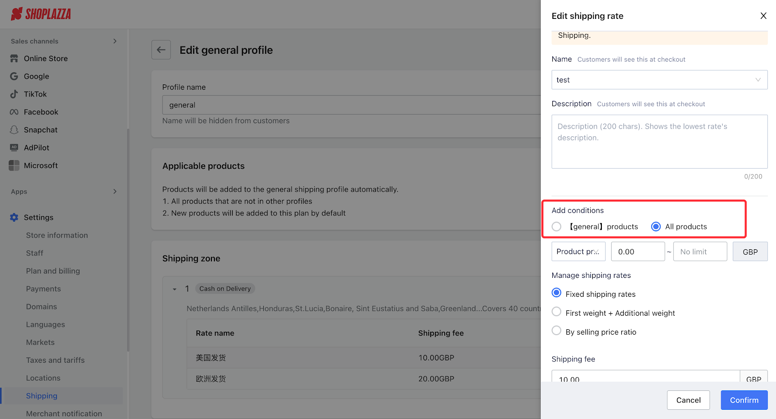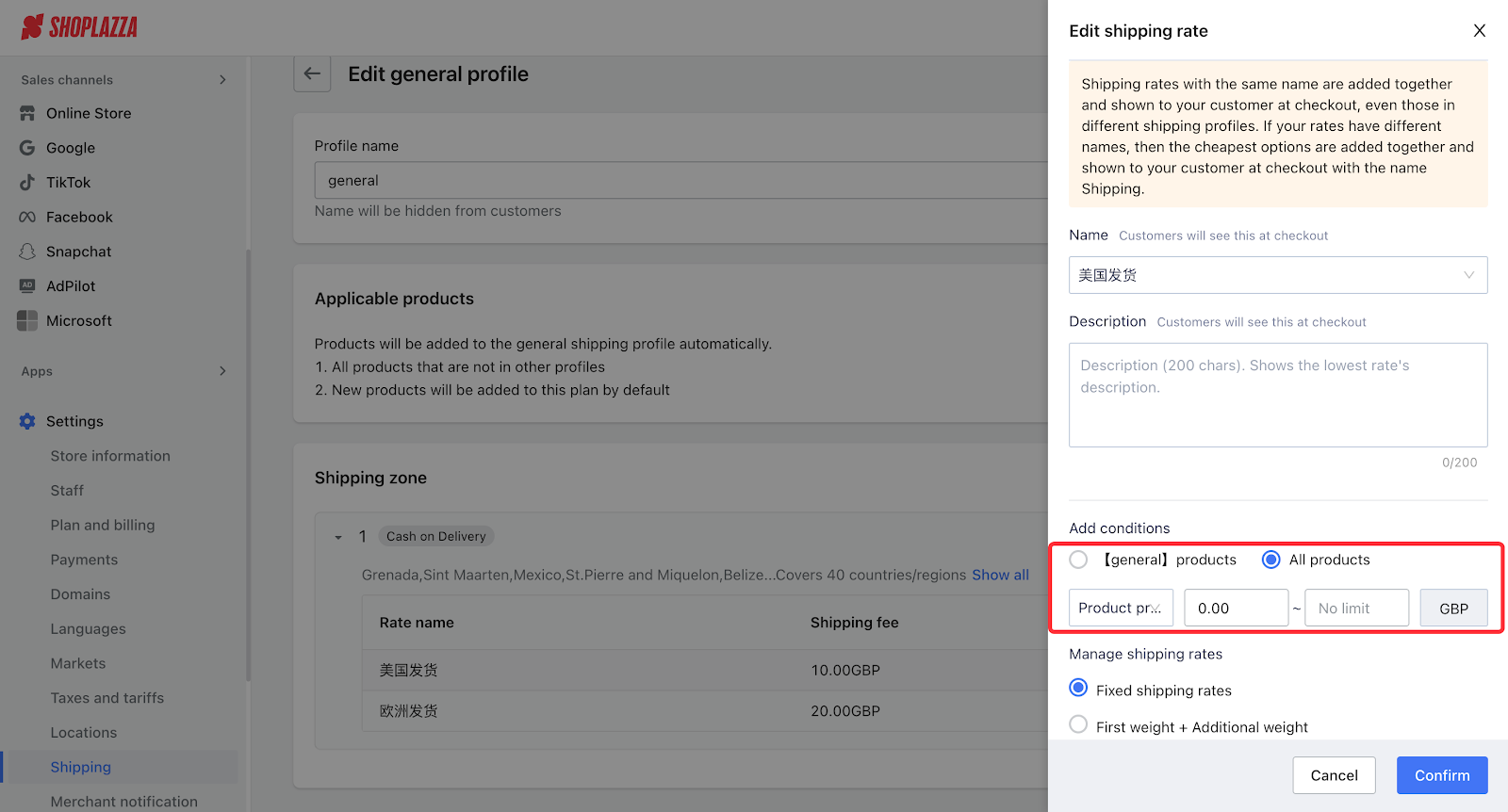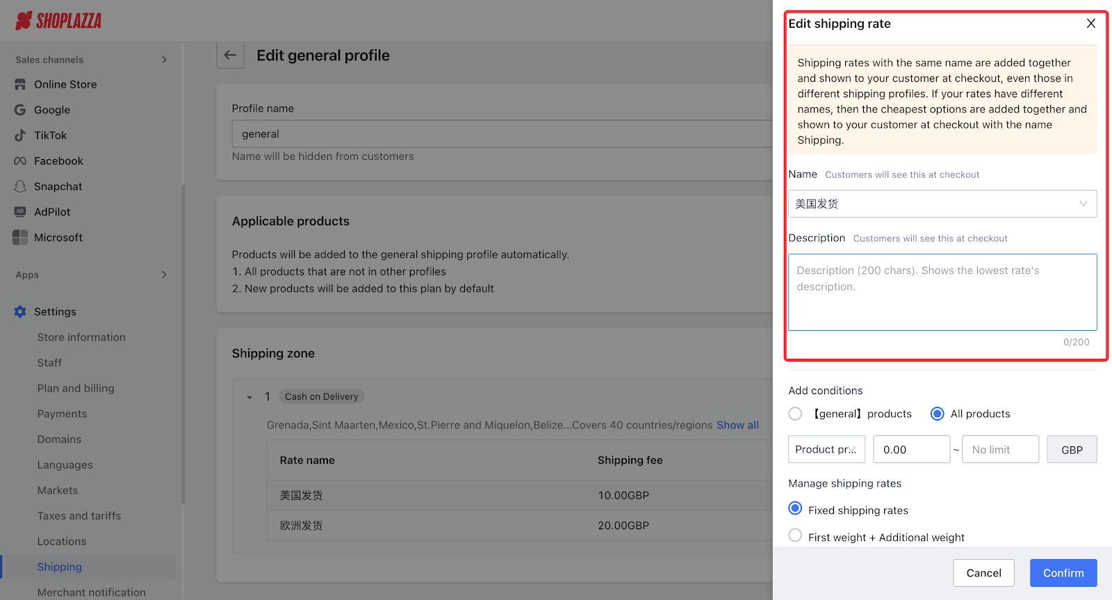 6. Set the shipping rate to Flat rate, enter 0 in the shipping fee field, and then click Confirm.