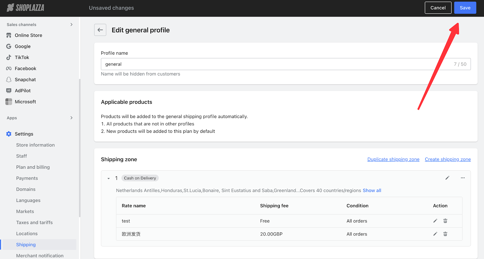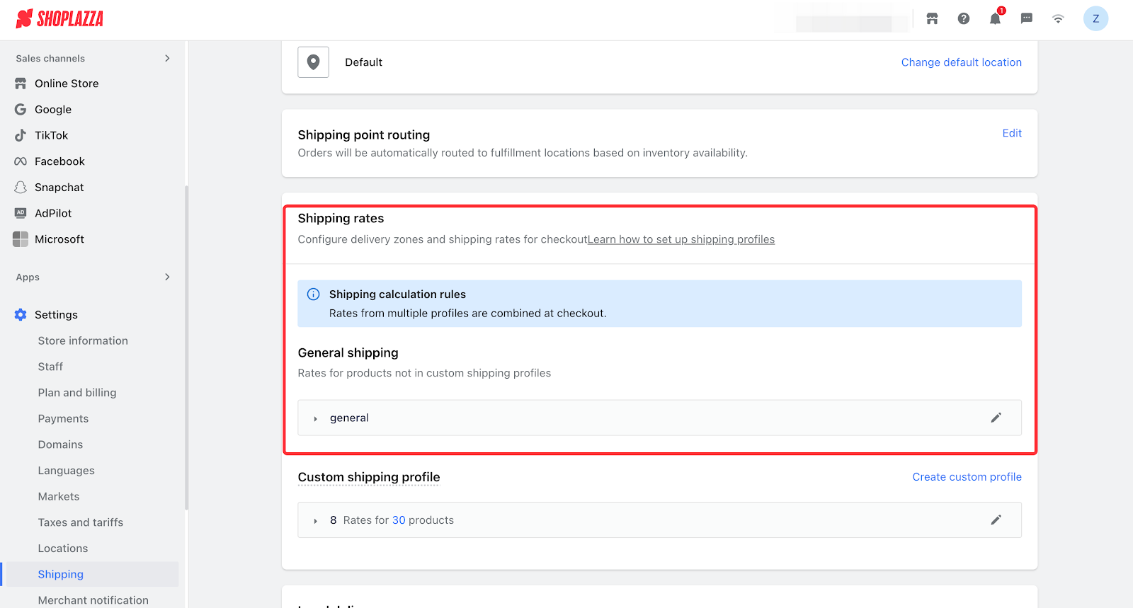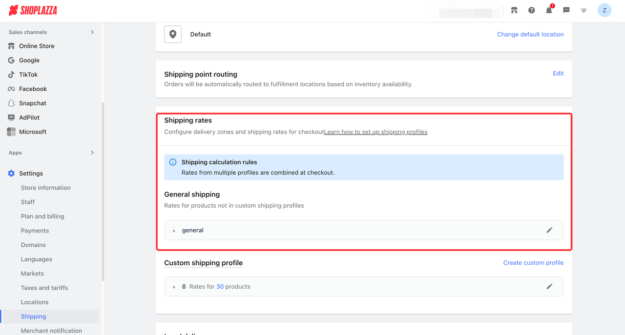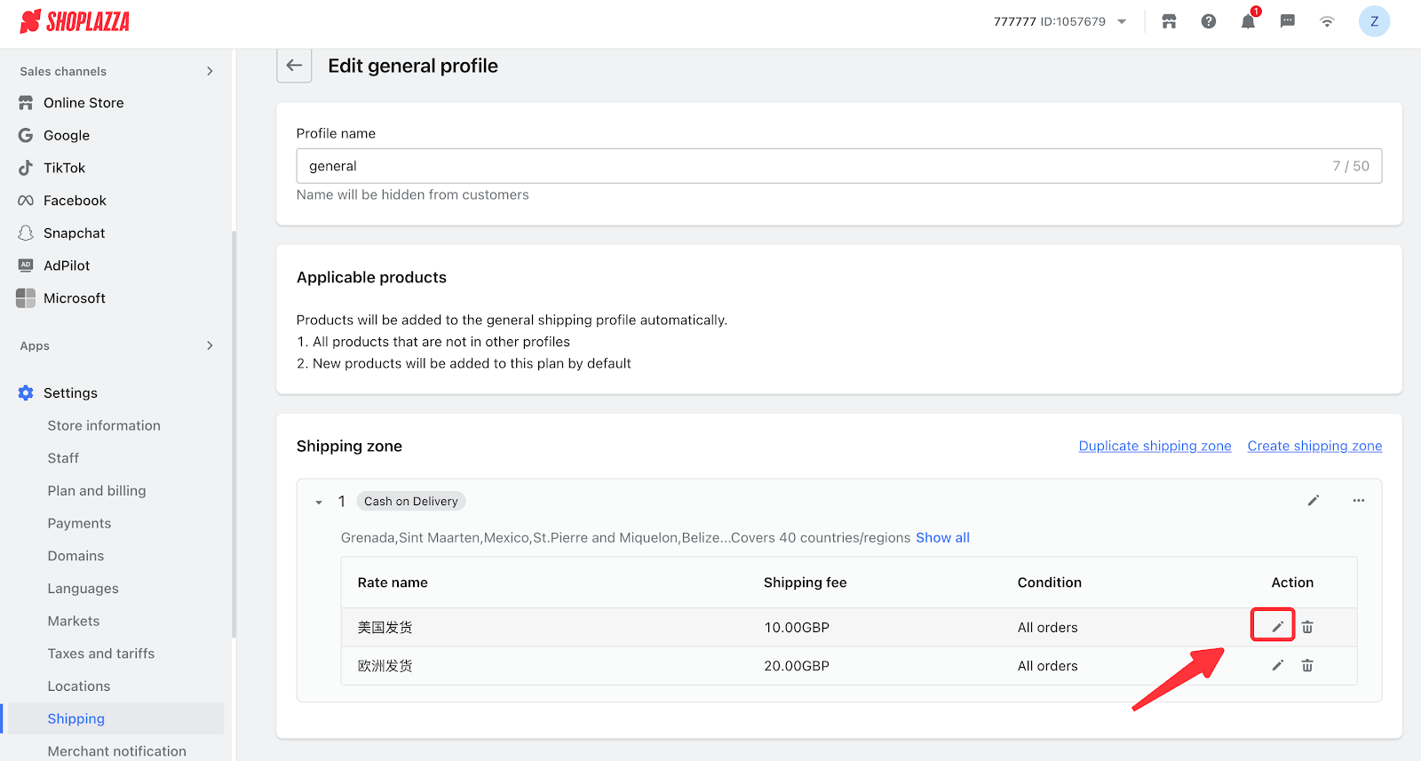 2. Locate the Shipping rate section and click Edit on the General shipping plan.