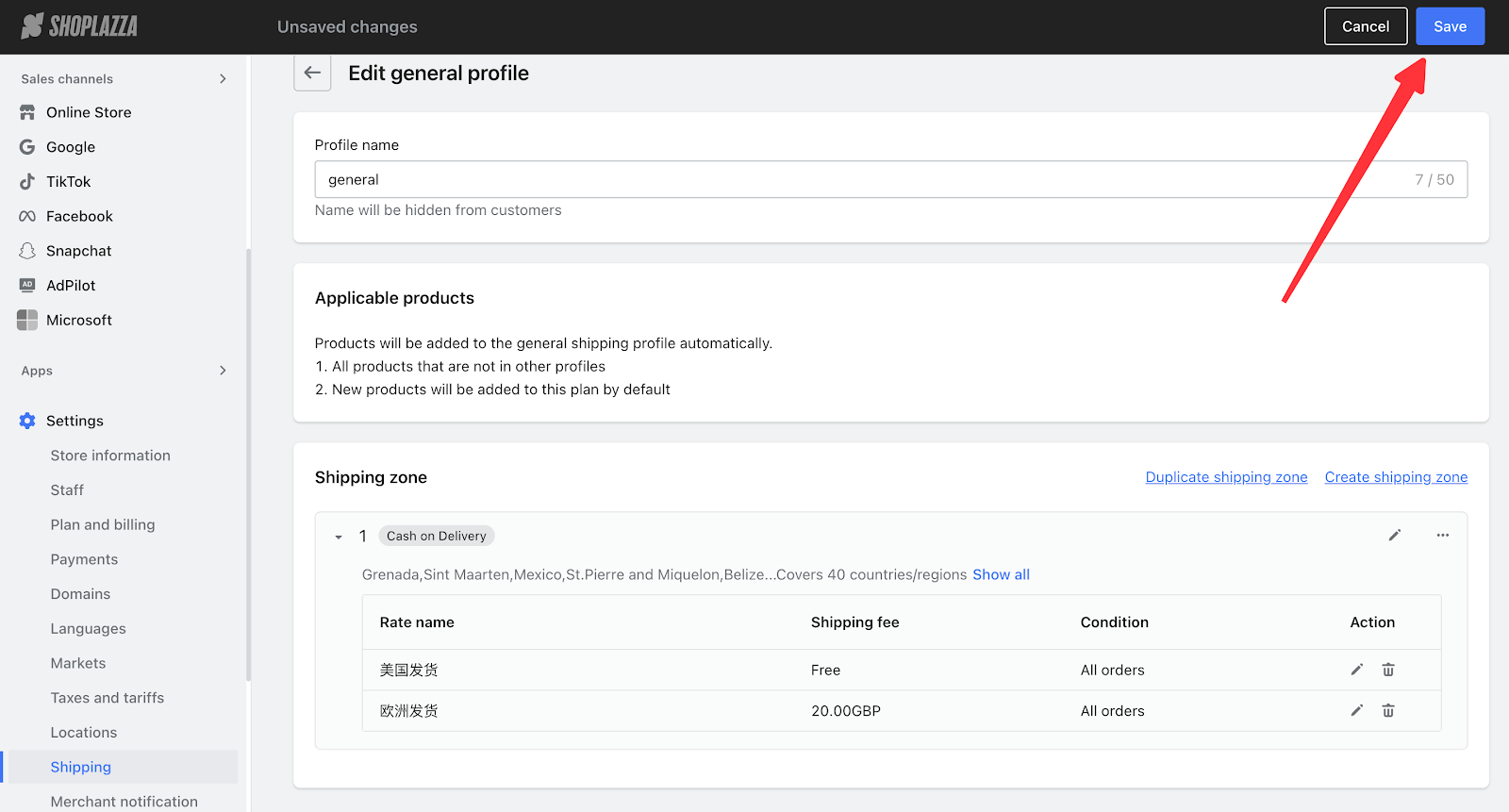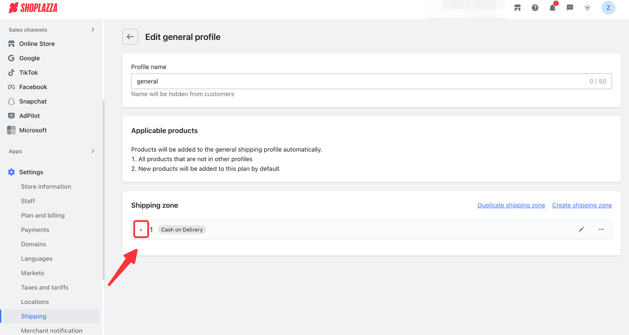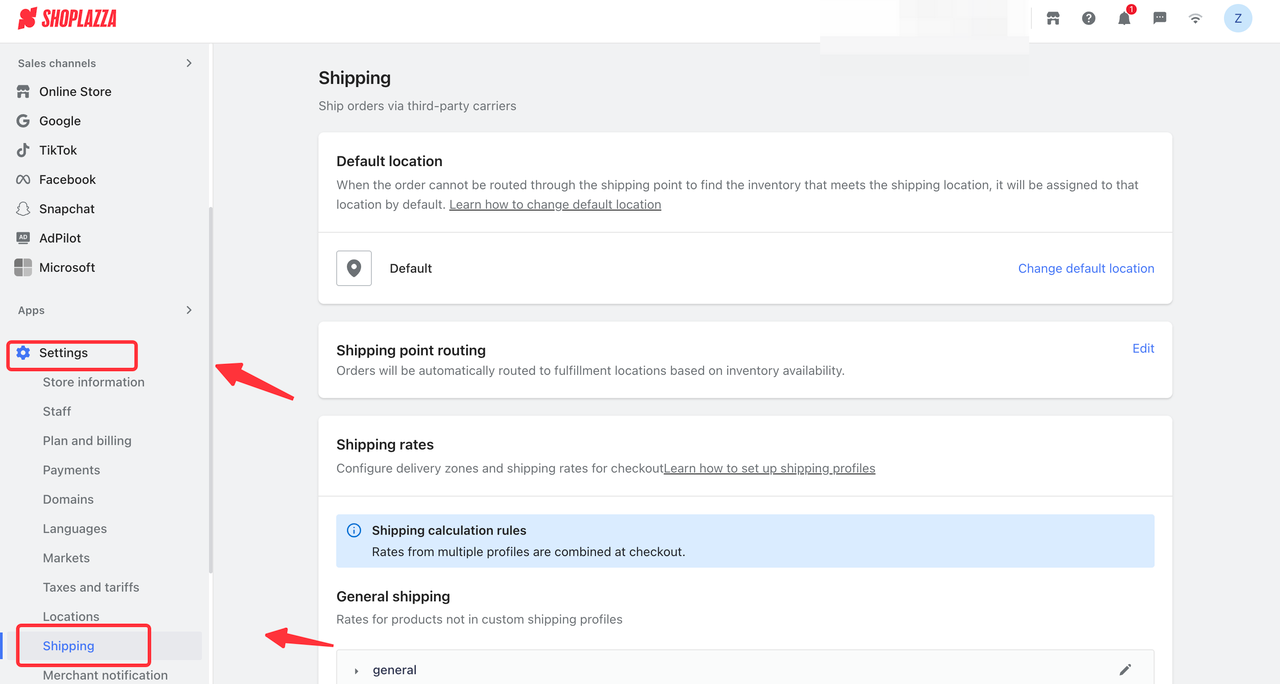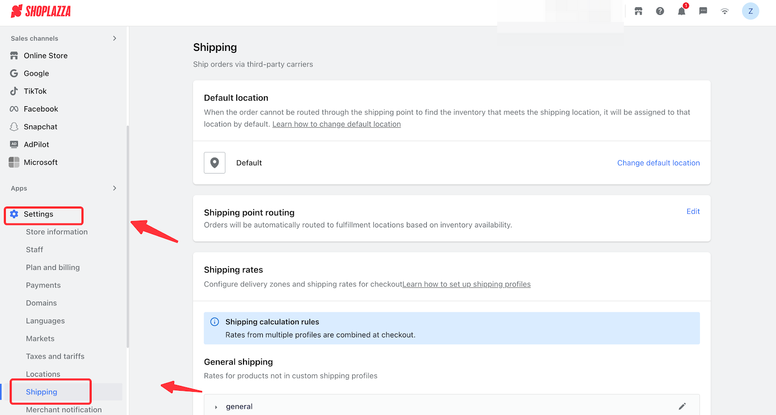 1. Log in to your Shoplazza Admin, then click Settings > Shipping.