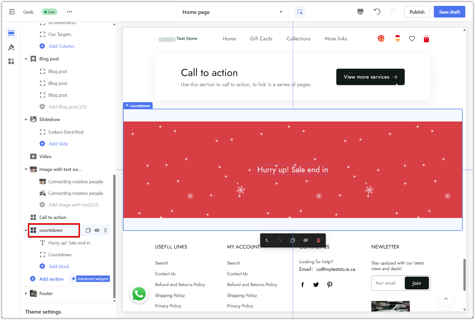 - Countdown block: Click the Countdown block to set an end time and adjust the loop length if you want the timer to reset. The timer displays days, hours, minutes, and seconds in real-time.