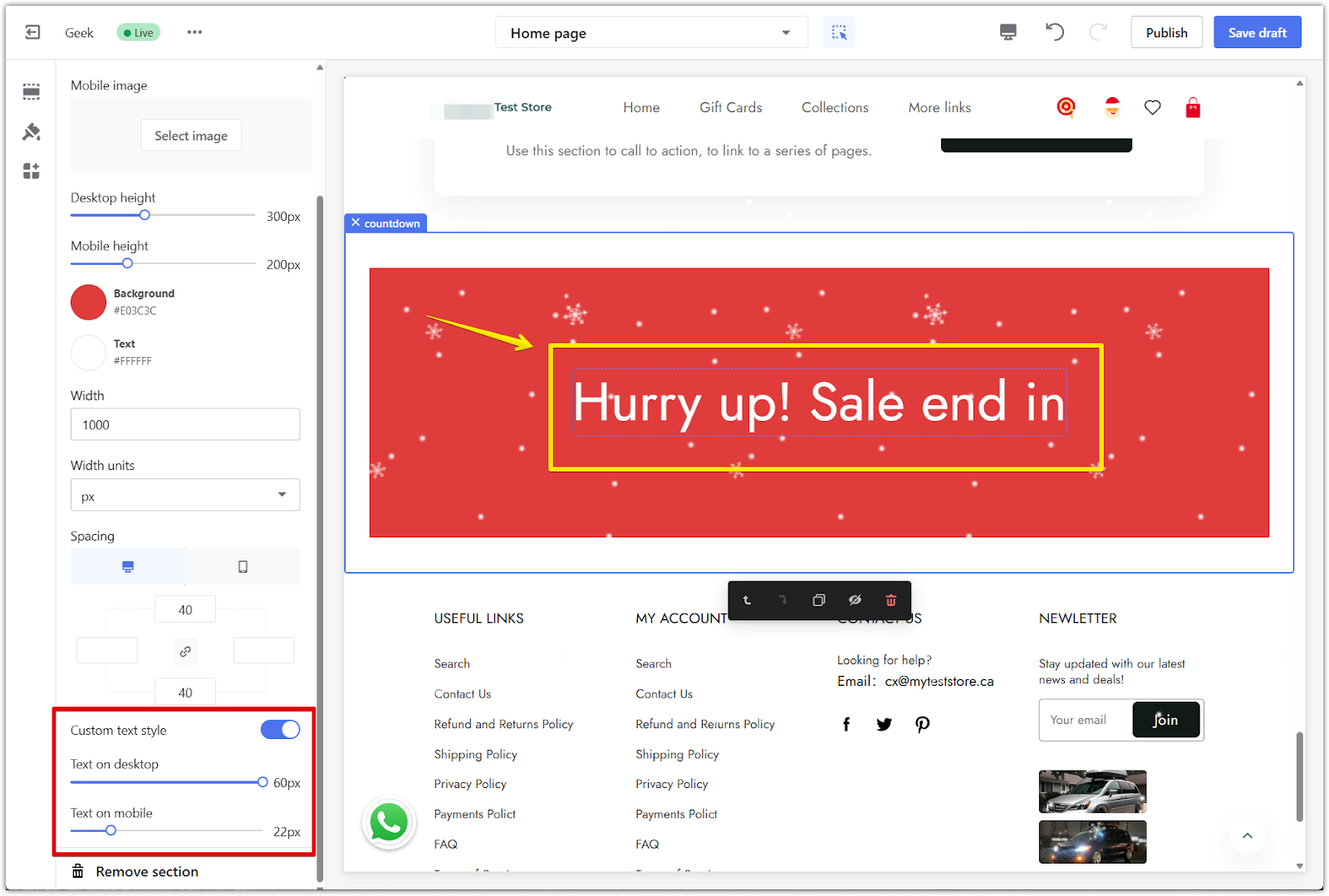 - Custom text style: Toggle this on to manually adjust text size for desktop and mobile views.