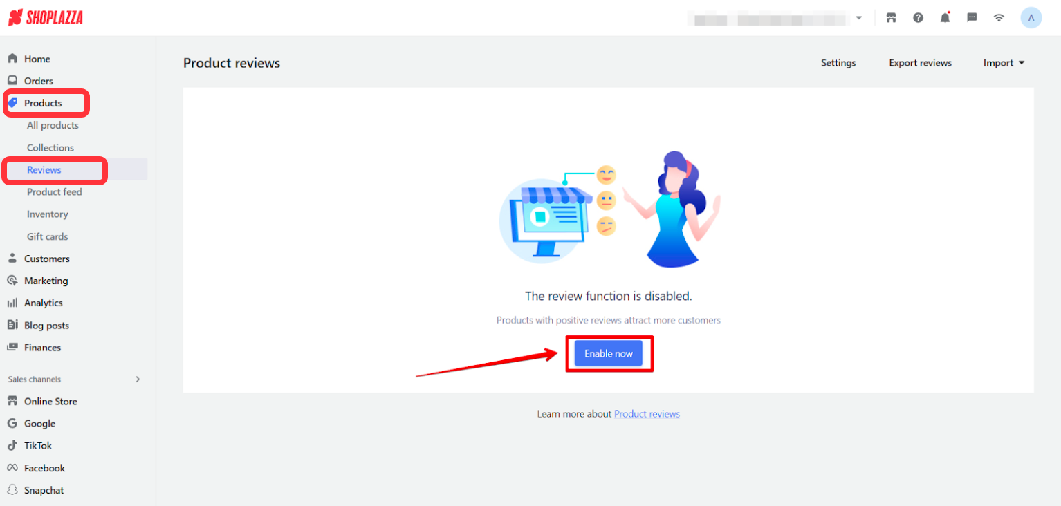 1. Log in to your Shoplazza admin, go to Products > Product Reviews, and click Enable Now to enter the review settings section.