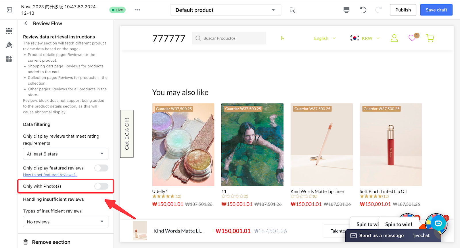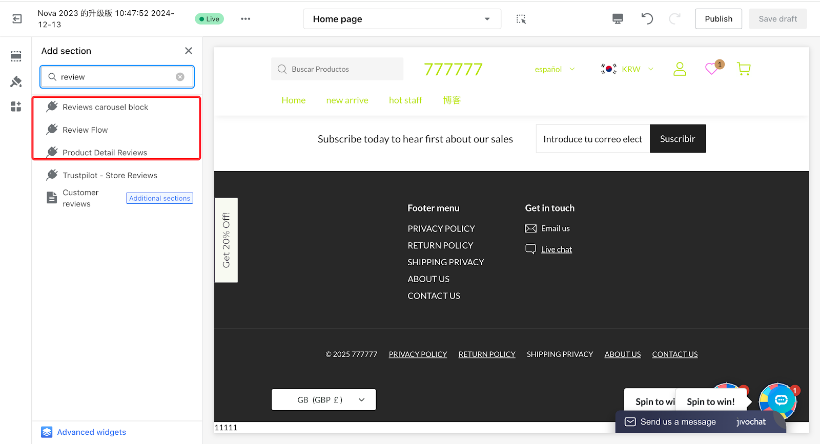 For these issues, please log in to your Shoplazza admin panel, go to Online Store > Theme Editor > Edit, and after entering the theme editor, check the settings of the comment card you added (Review Carousel Block, Review Flow , or Product Detail Reviews ).