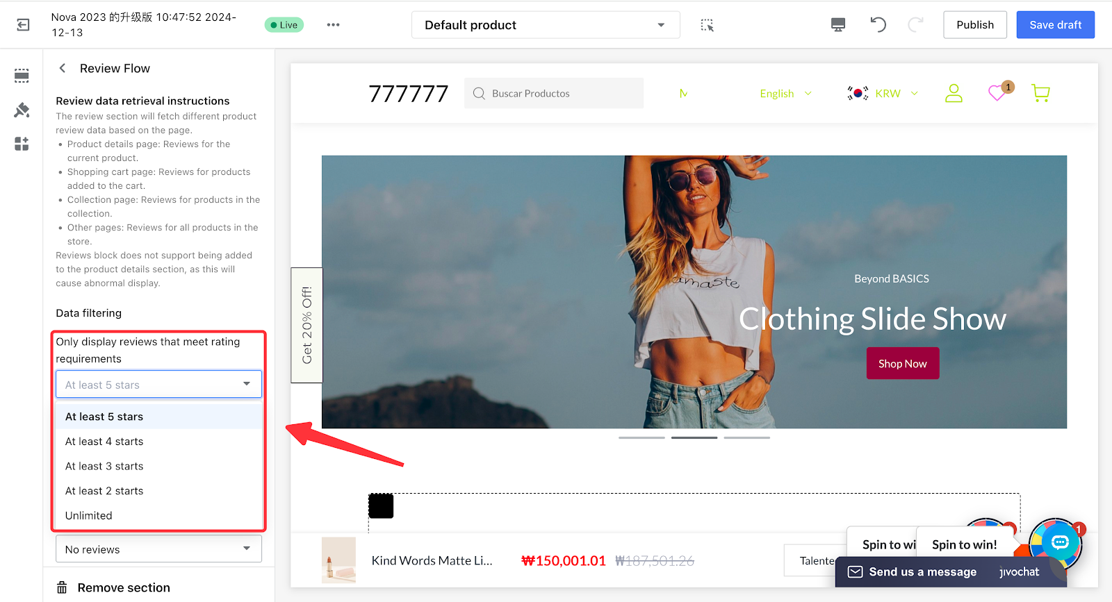 5 Display review stars under product titles Choose whether to show or hide review star ratings on the product detail page, homepage, collection detail page, and other locations. You can also configure the star color.