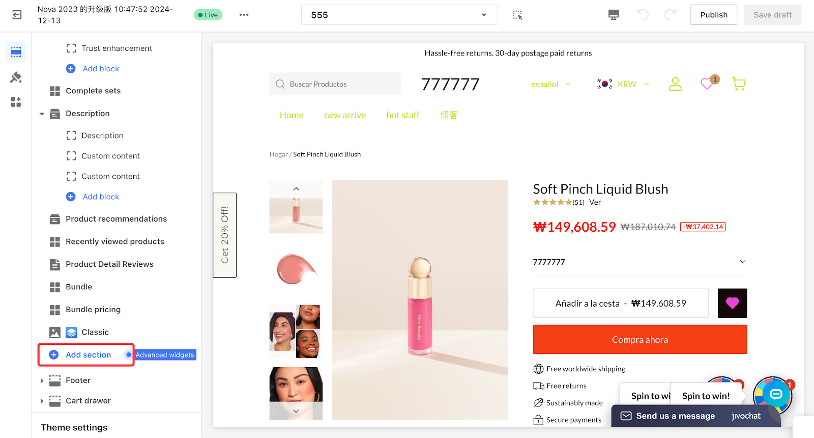 • Product Detail Reviews and Review Flow cannot be added inside the product detail card. The Review Carousel Block can only be configured within the product detail card and the drawer cart card; otherwise, it may cause display style issues.