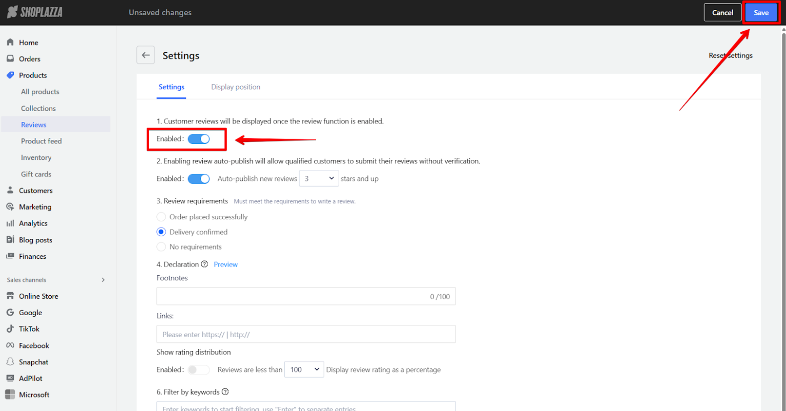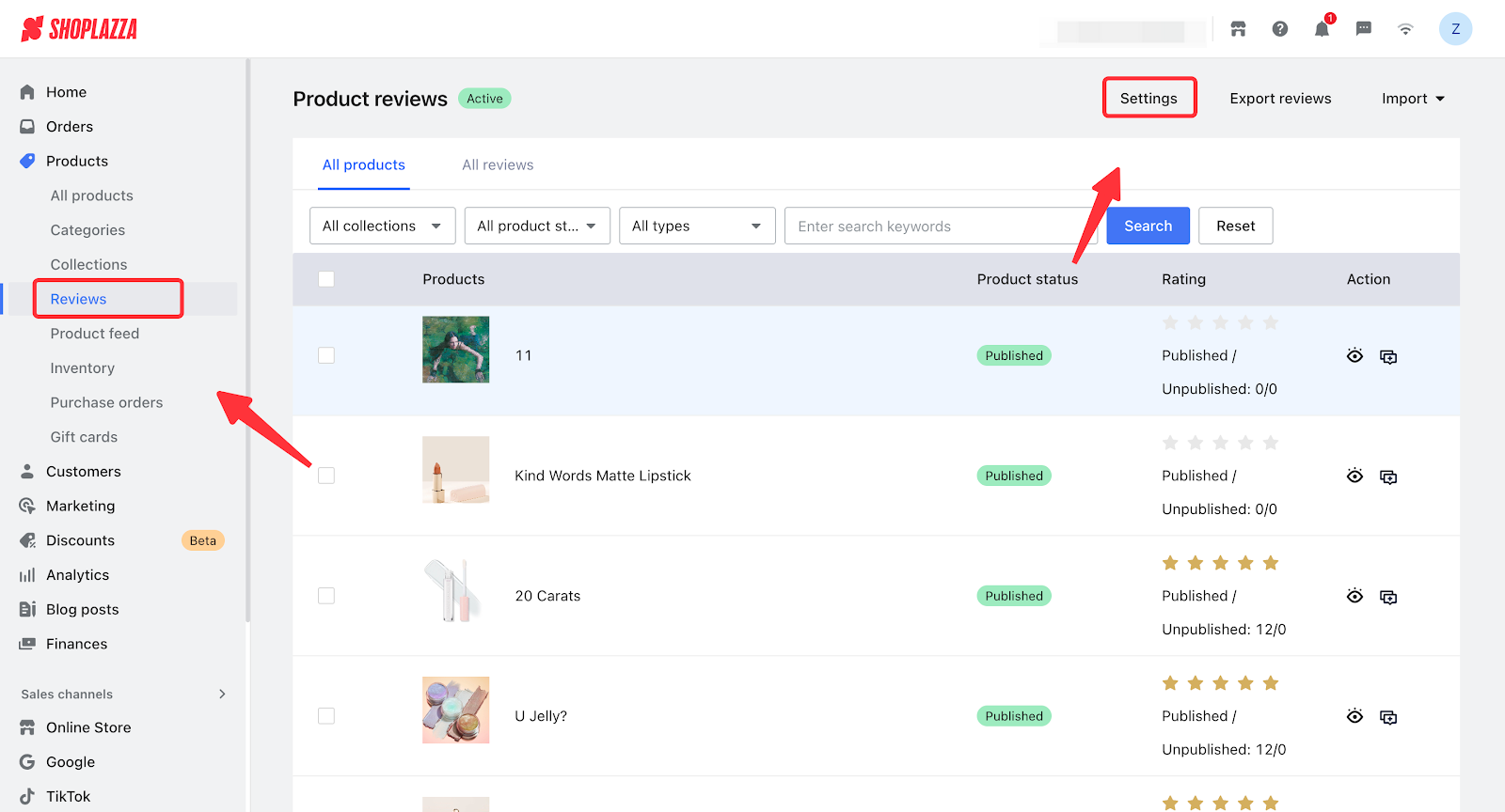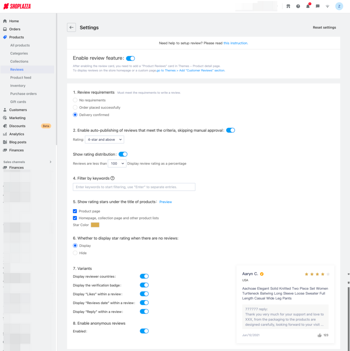 Product reviews are an important tool for building customer trust and driving sales. The Shoplazza admin panel has an integrated review feature that you can easily configure and manage.