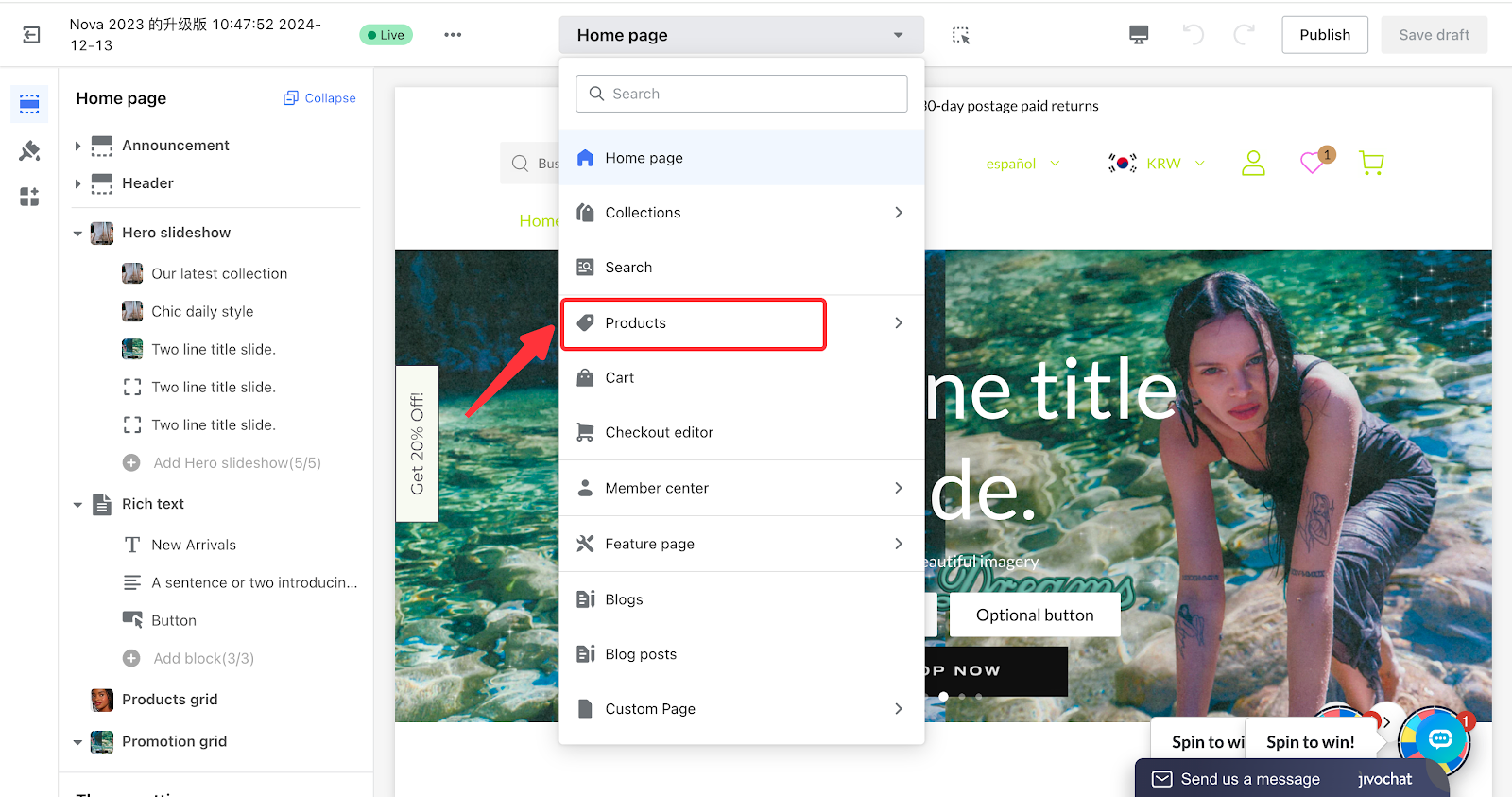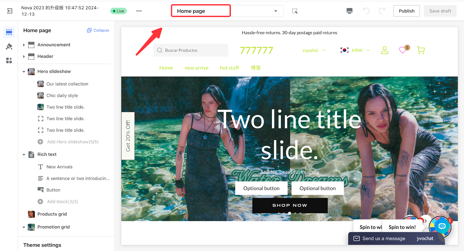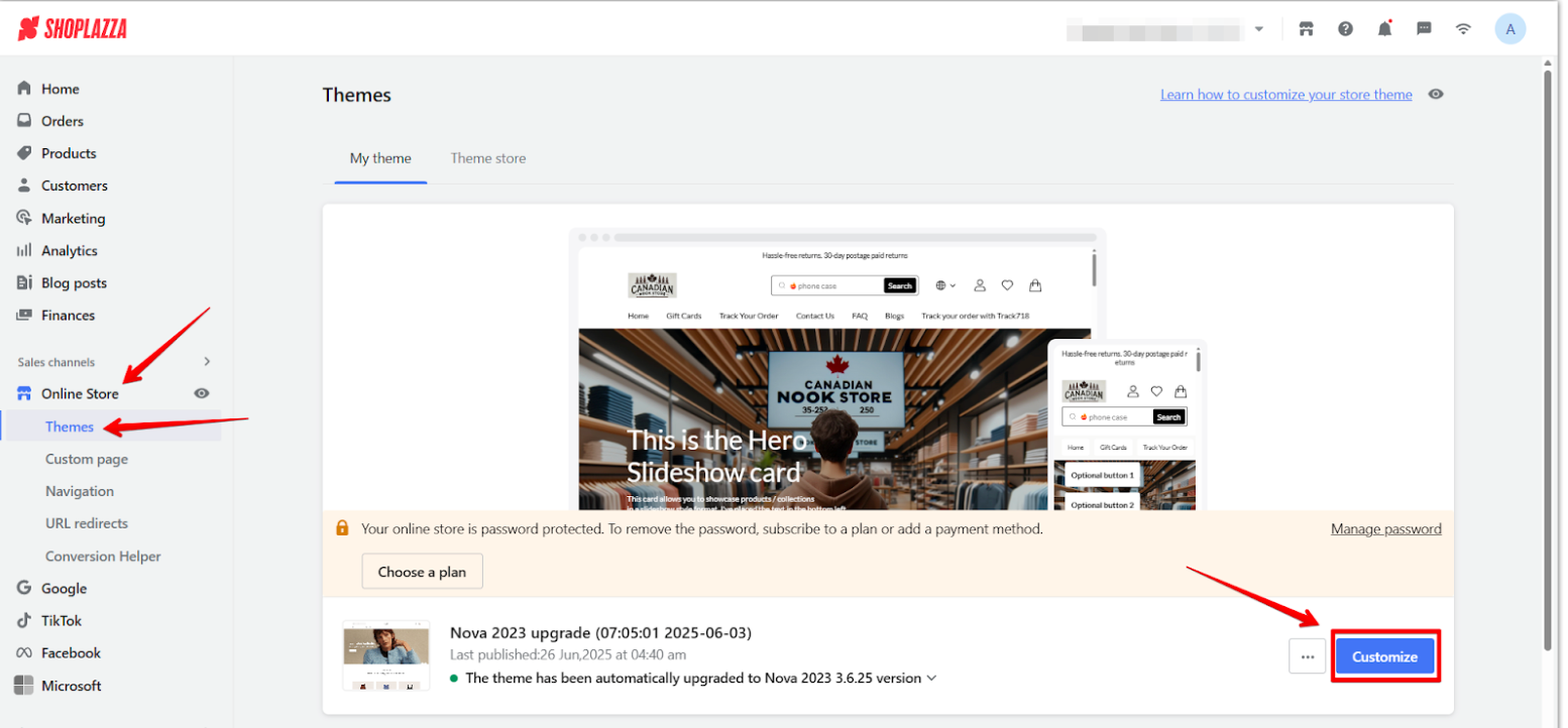 1. Open theme editor: Go to Shoplazza admin > Online Store > Themes and click Customize on your active theme.