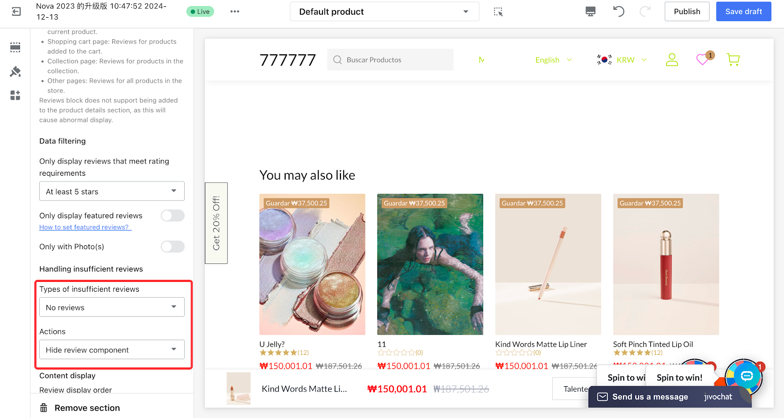 A: Check whether the "Only show reviews that meet the rating requirements" setting has filtered out some reviews. If no filtering is applied here, please click to see more troubleshooting ideas: Troubleshoot and fix product review display issues.