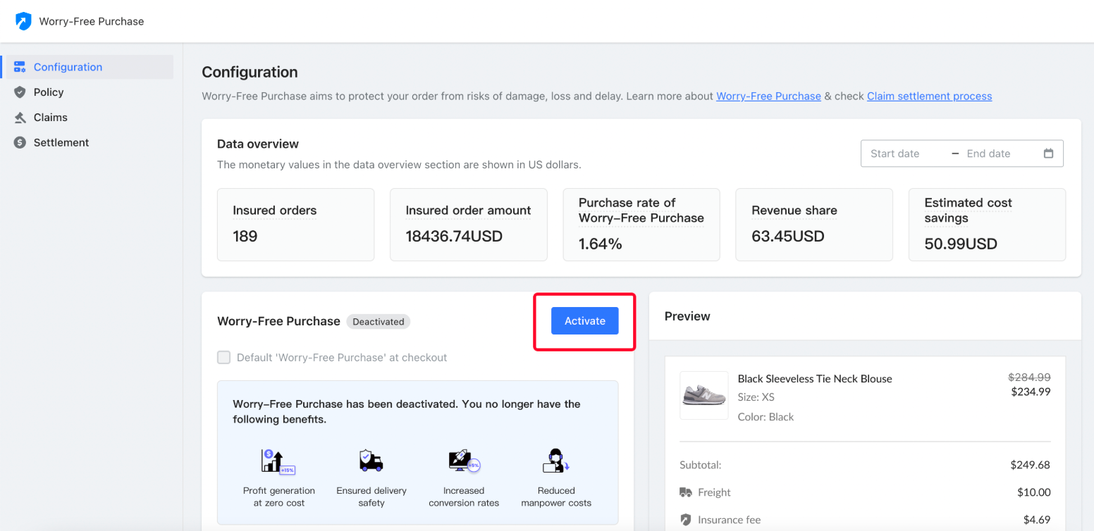 2. Enable the Service: After entering the app’s homepage, go to the configuration page and click the Activate button. The shipping protection purchase option will then be automatically added to your store’s checkout page, and you can preview the service effect in the preview panel on the right.