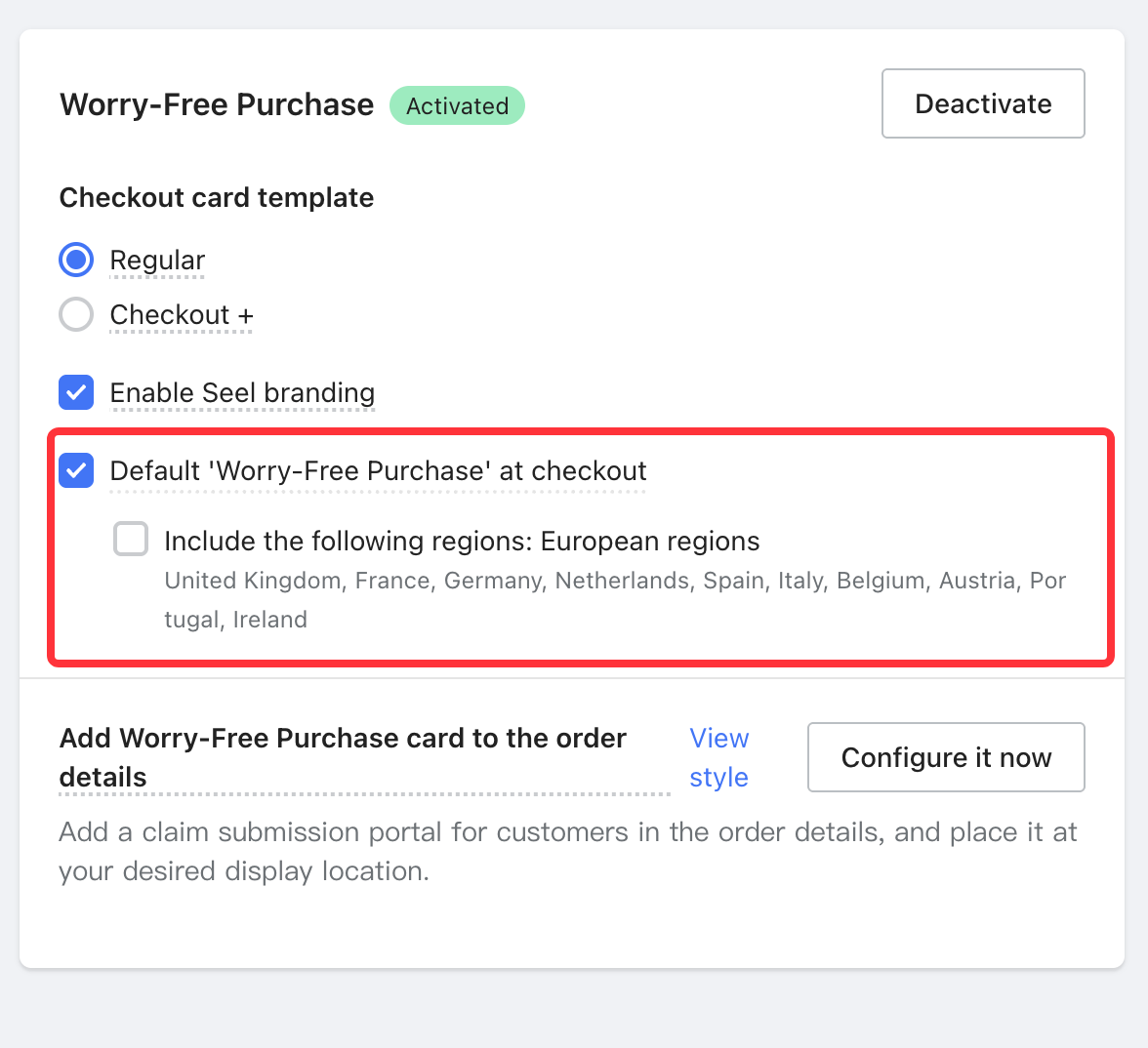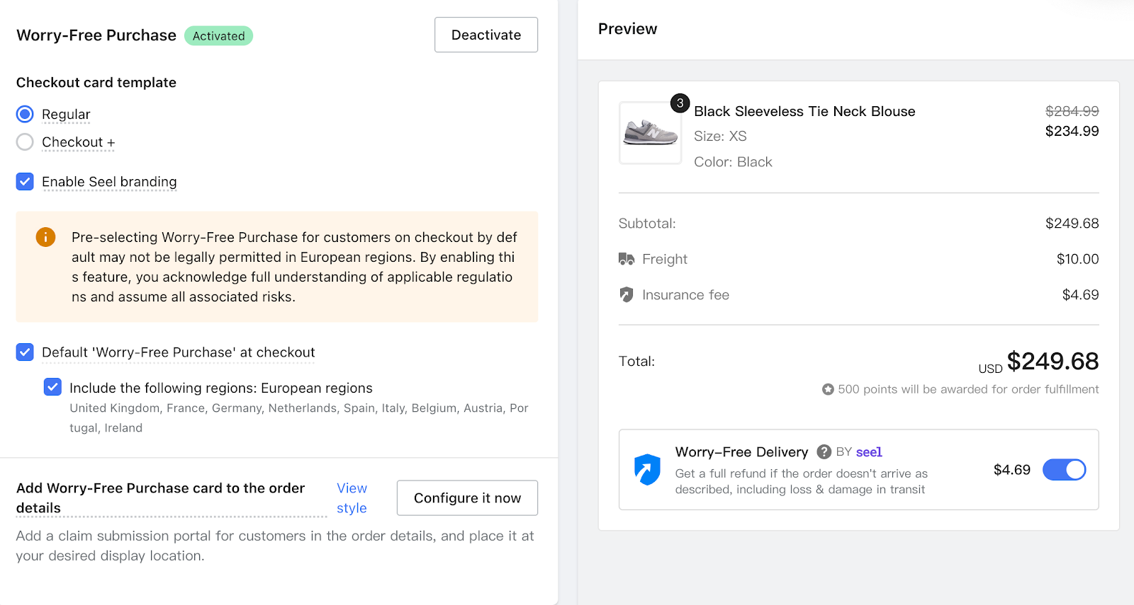 5. After enabling the default 'Worry-Free Purchase' at checkout, you can choose to enable or disable it specifically for customers in Europe.