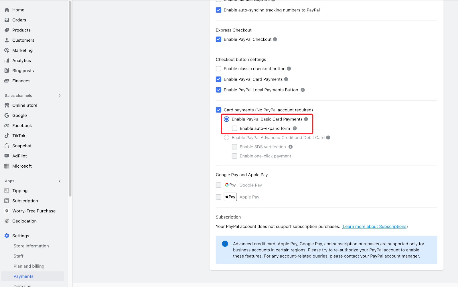 - Locate the Credit and Debit Card settings (PayPal login is not required for buyer) section. Select Enable PayPal Basic Credit and Debit Card.