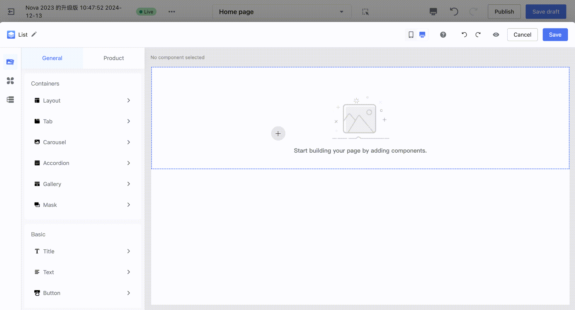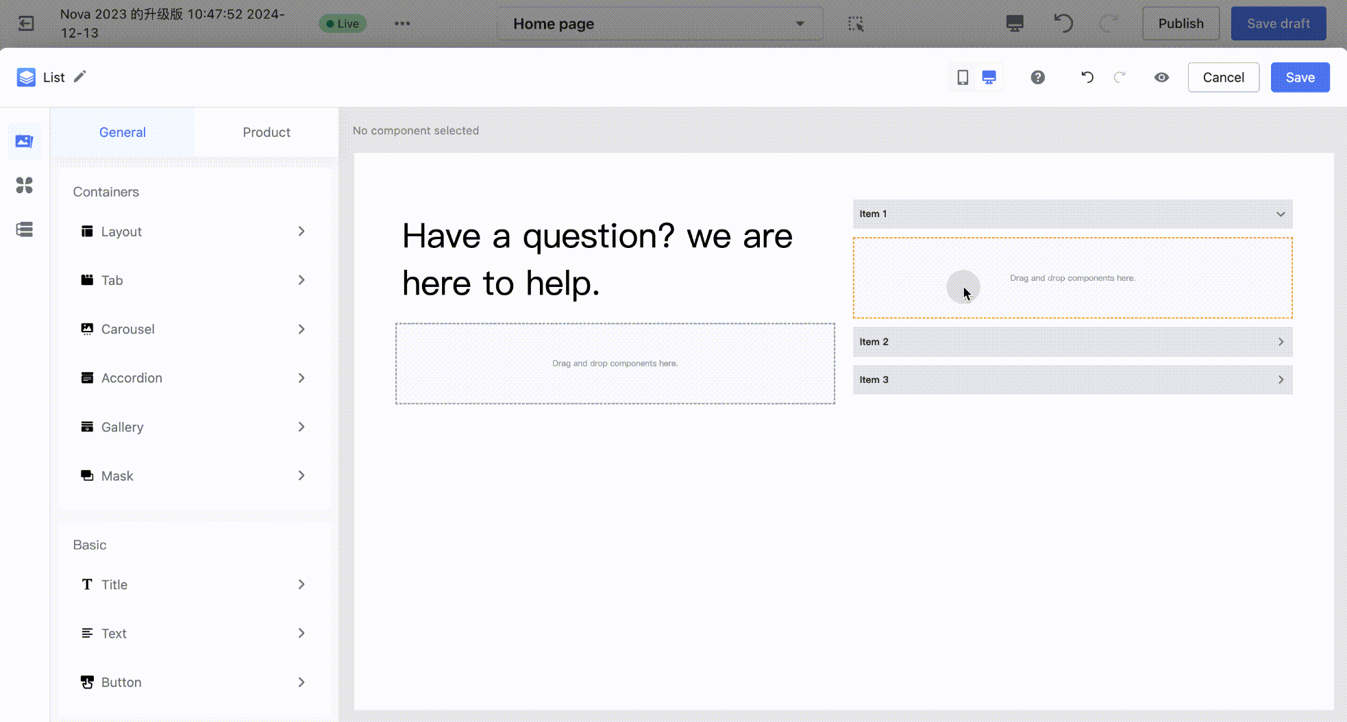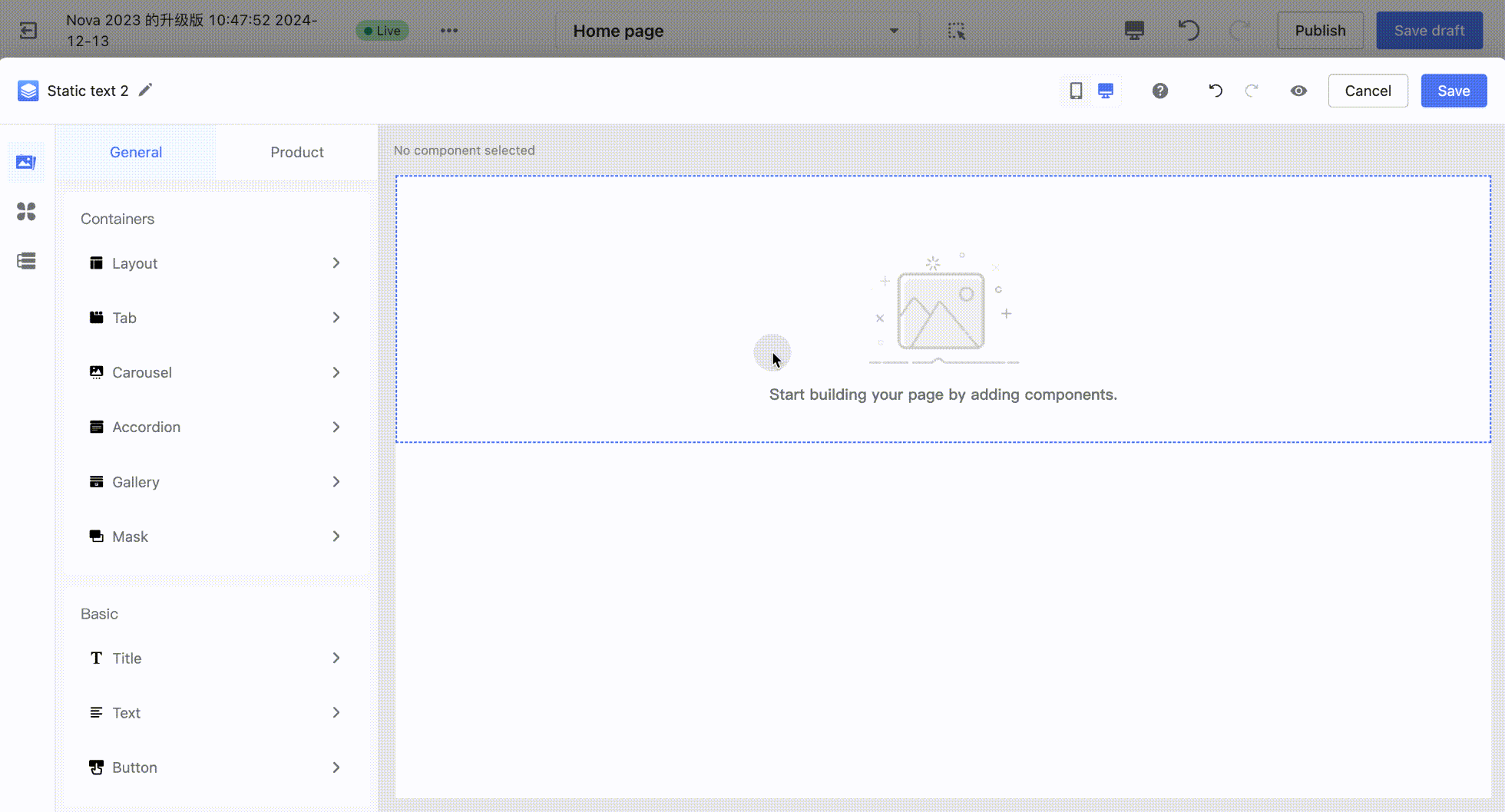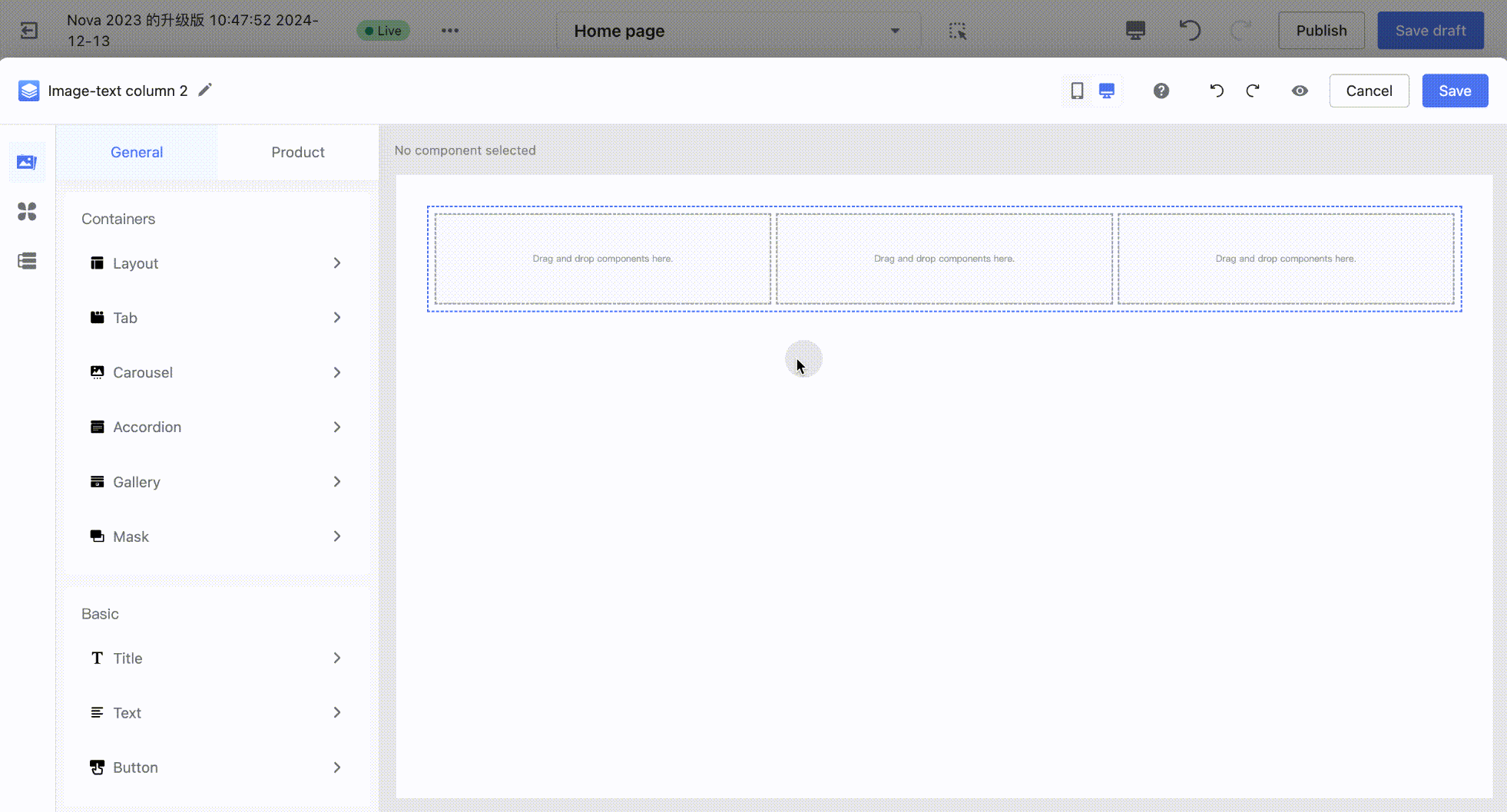 The basic components of Page Builder. Without needing any code, you can simply drag and drop components onto the canvas to create cards. You can design various types of cards based on your needs, such as text-and-image columns, floating photo walls, Q&A cards, and more.