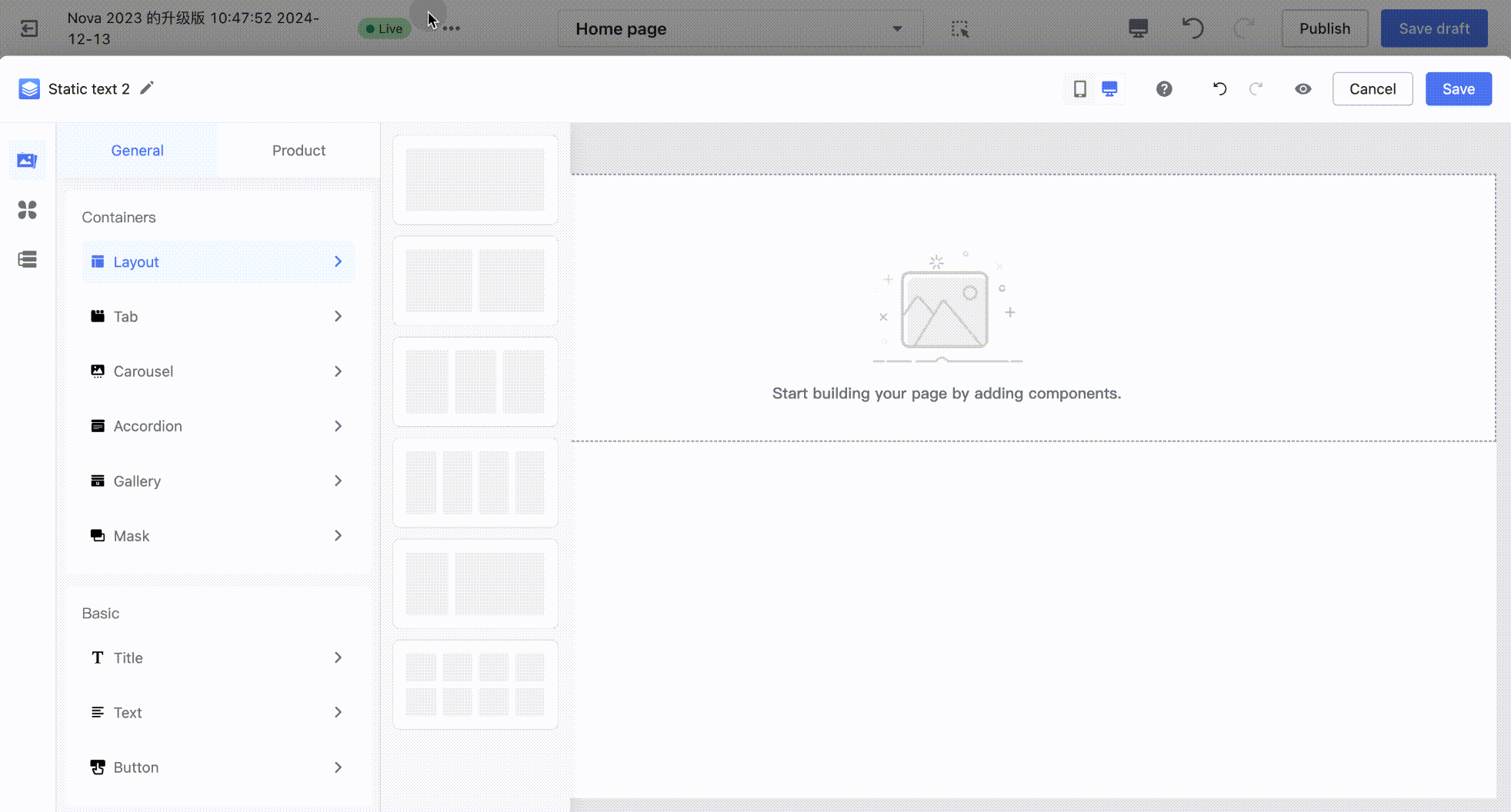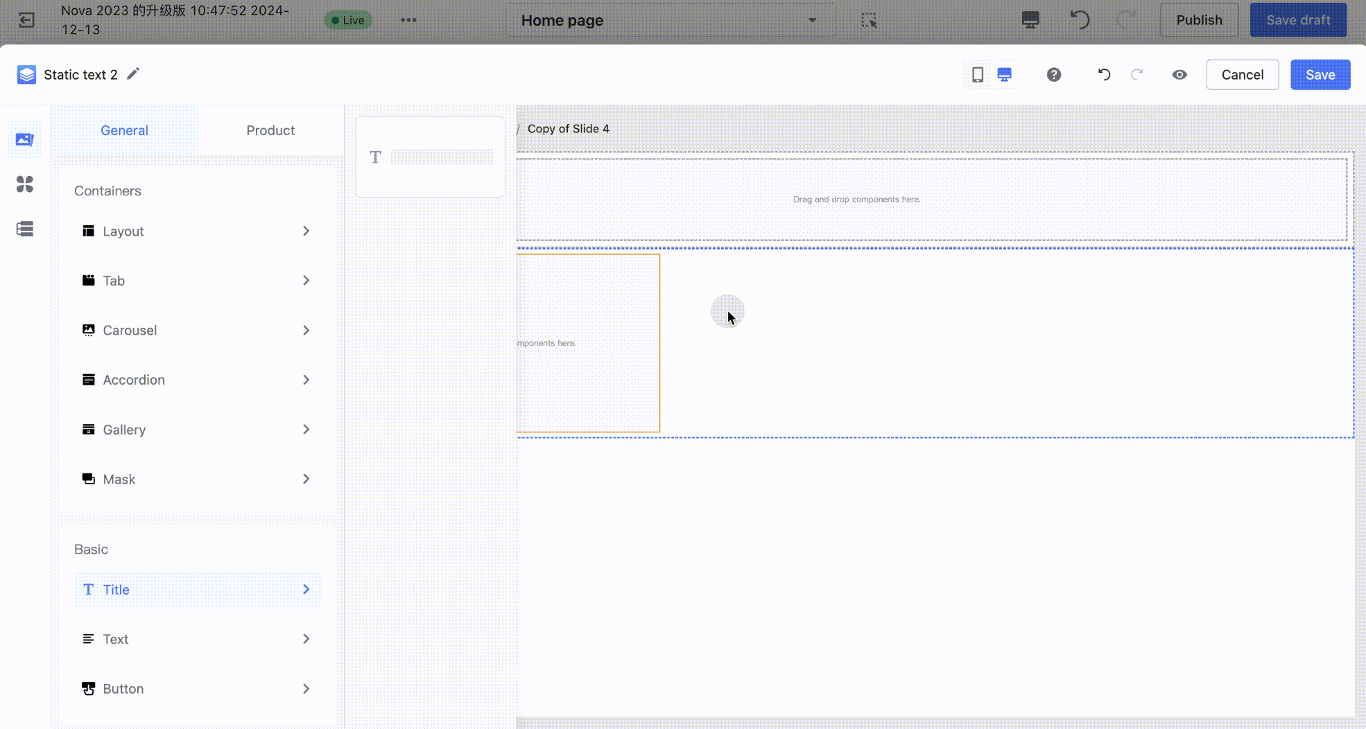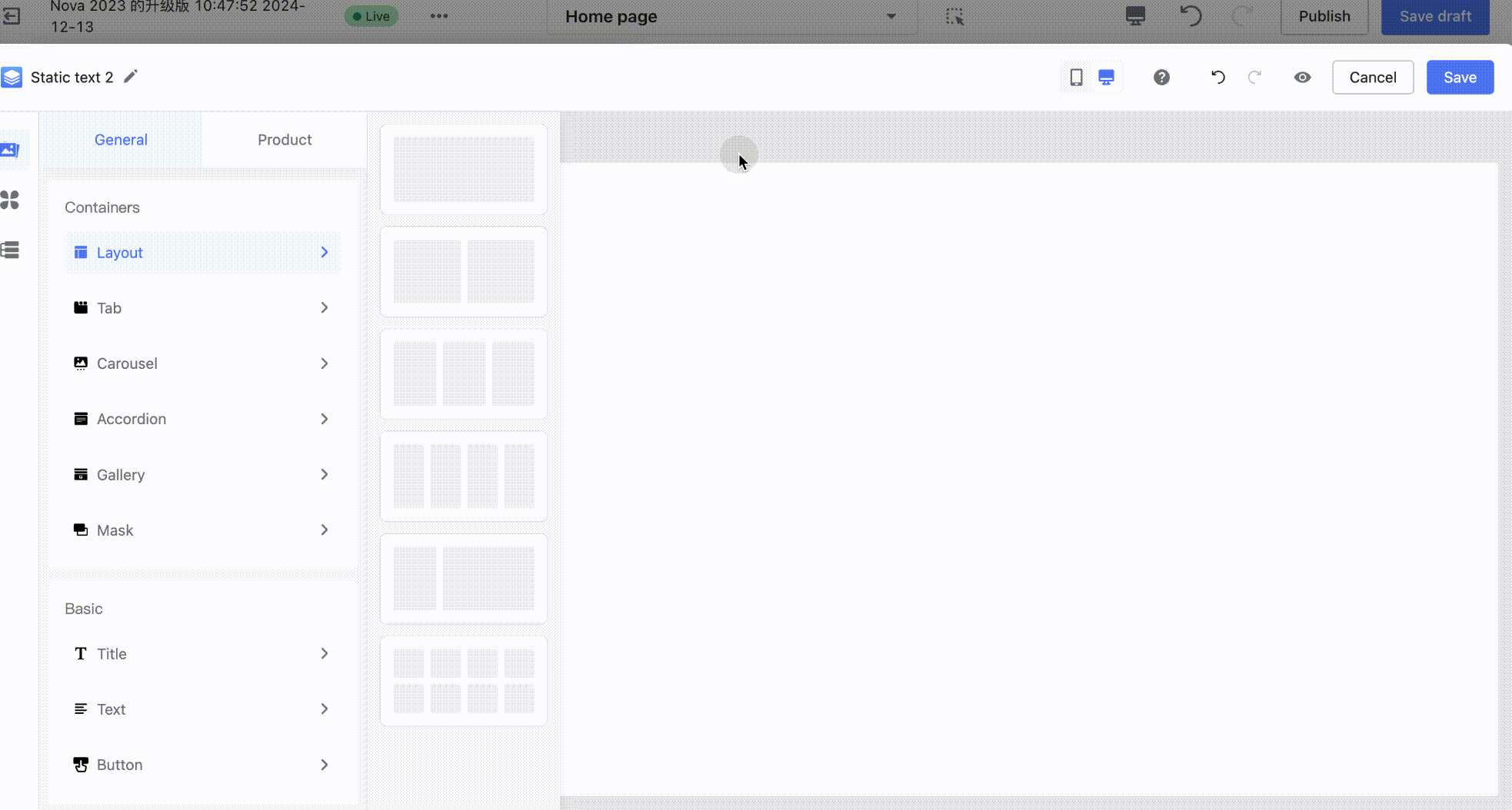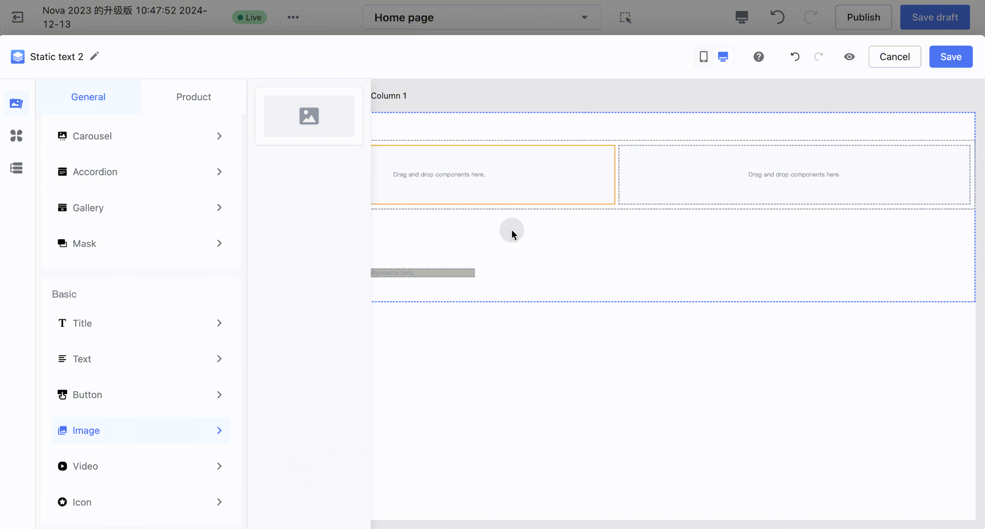 The basic components of Page Builder. Without needing any code, you can simply drag and drop components onto the canvas to create cards. You can design various types of cards based on your needs, such as text-and-image columns, floating photo walls, Q&A cards, and more.