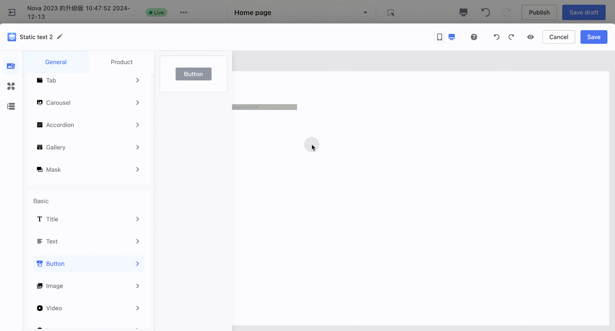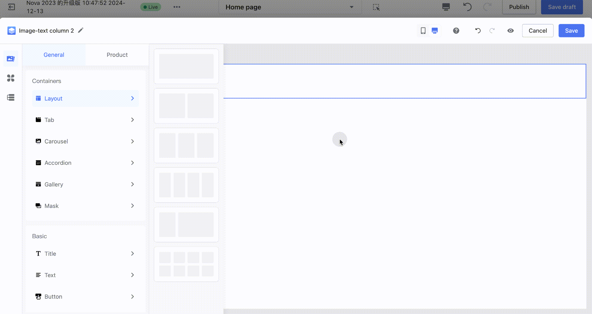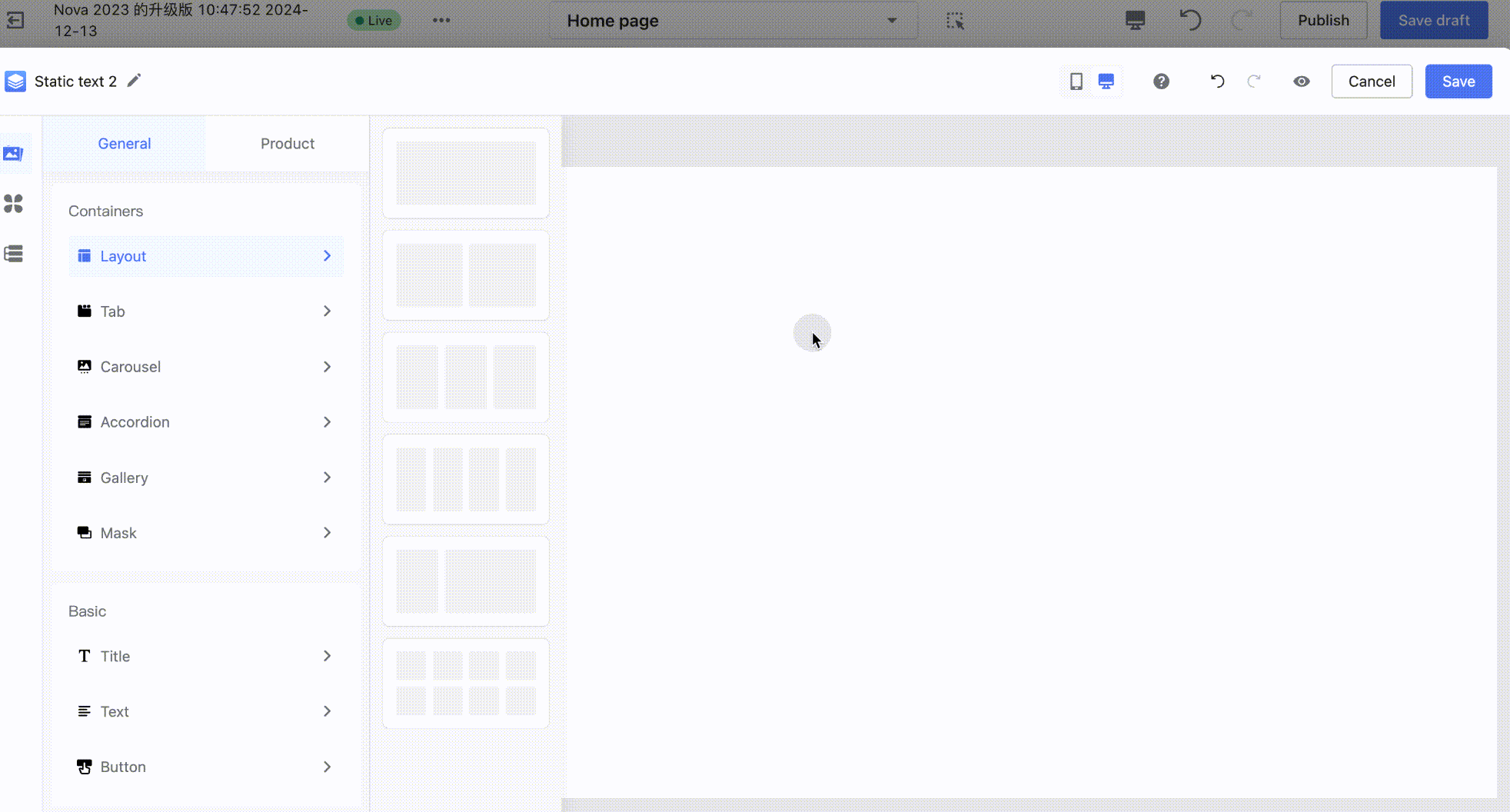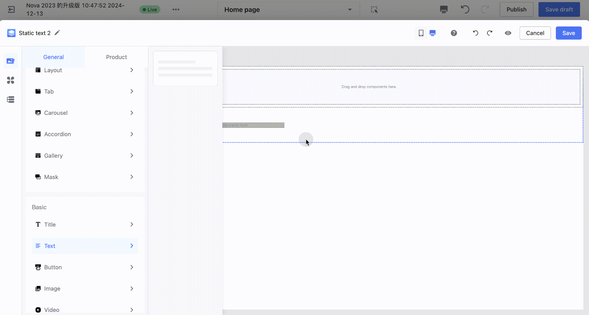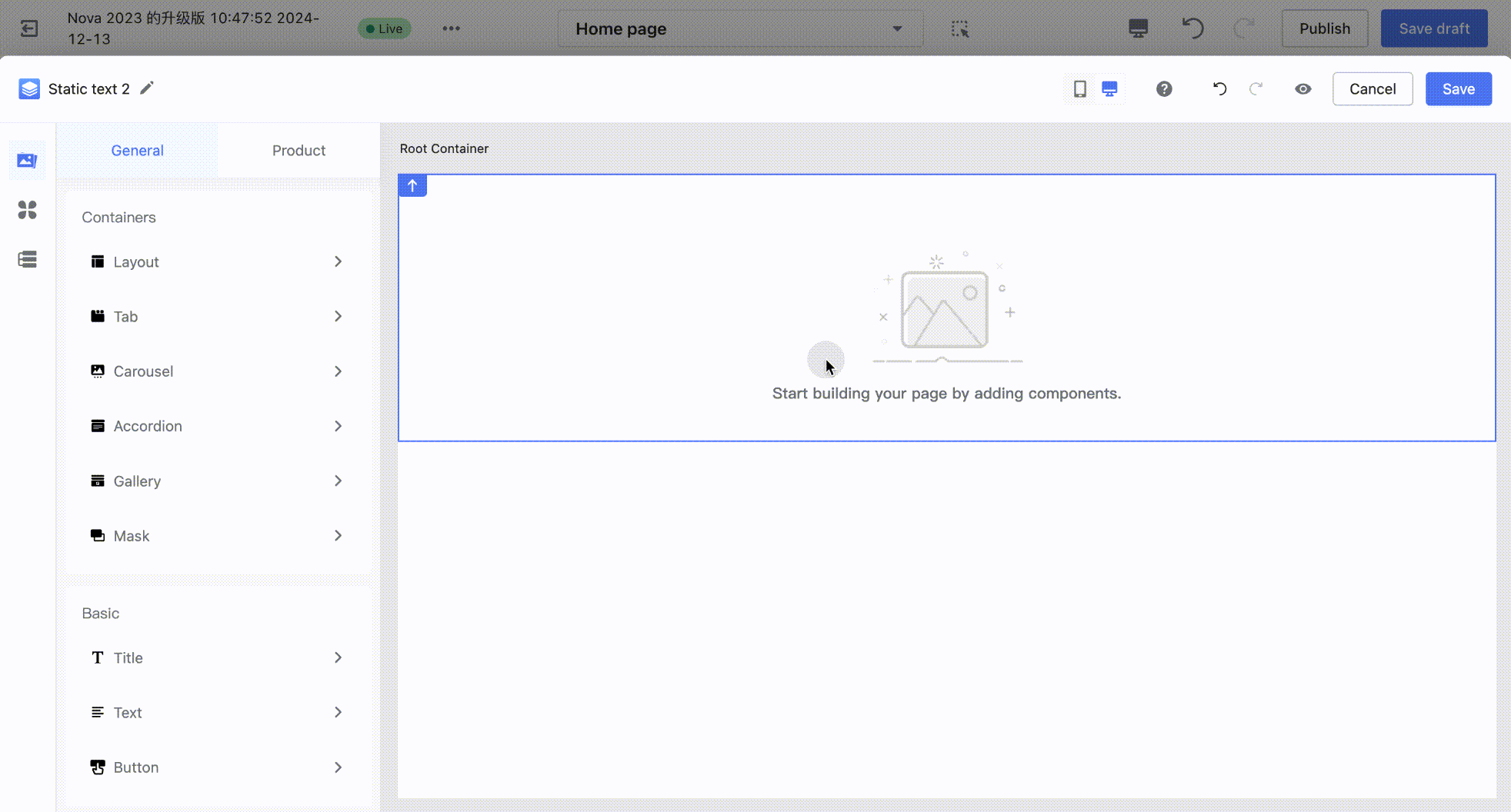The basic components of Page Builder. Without needing any code, you can simply drag and drop components onto the canvas to create cards. You can design various types of cards based on your needs, such as text-and-image columns, floating photo walls, Q&A cards, and more.