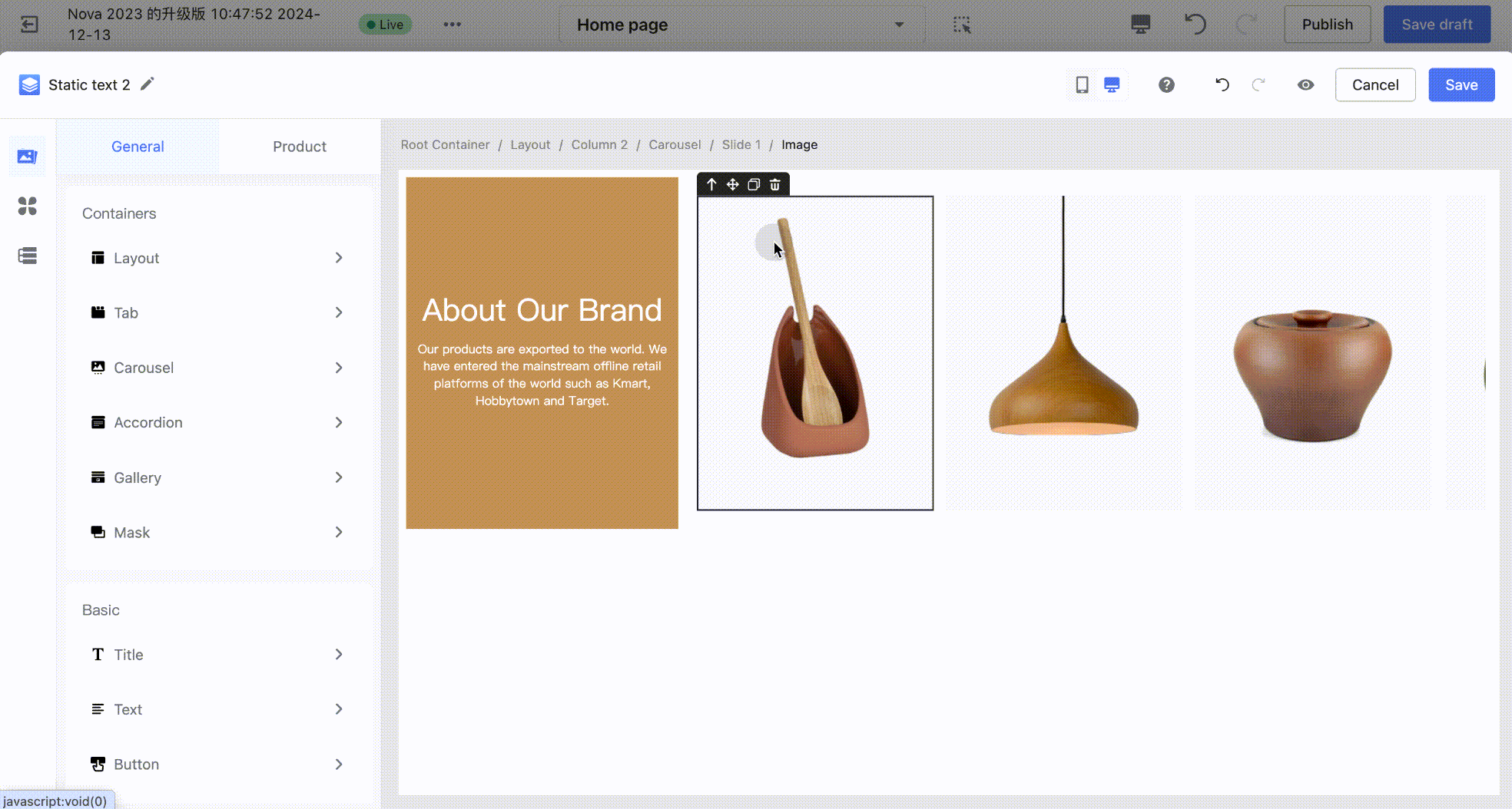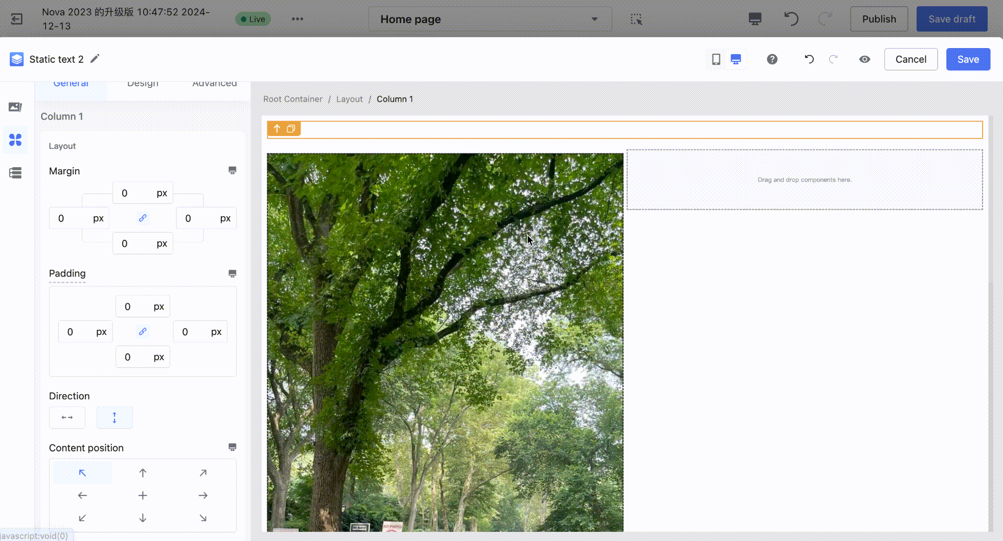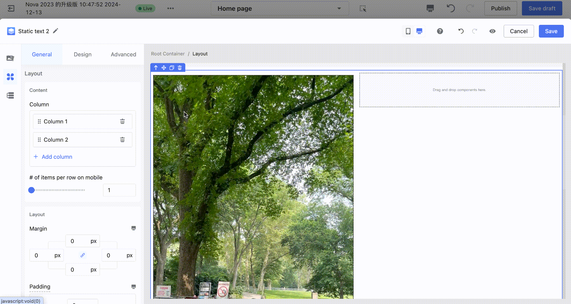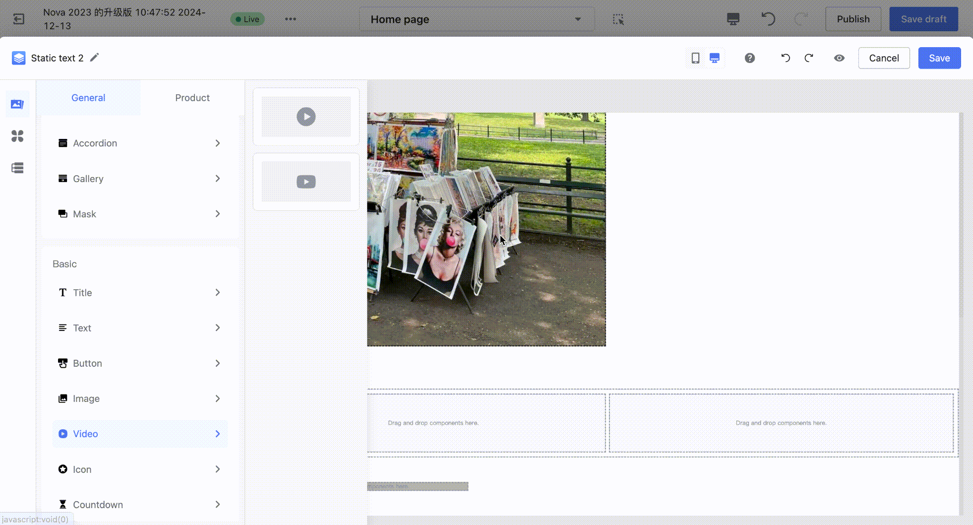 The basic components of Page Builder. Without needing any code, you can simply drag and drop components onto the canvas to create cards. You can design various types of cards based on your needs, such as text-and-image columns, floating photo walls, Q&A cards, and more.