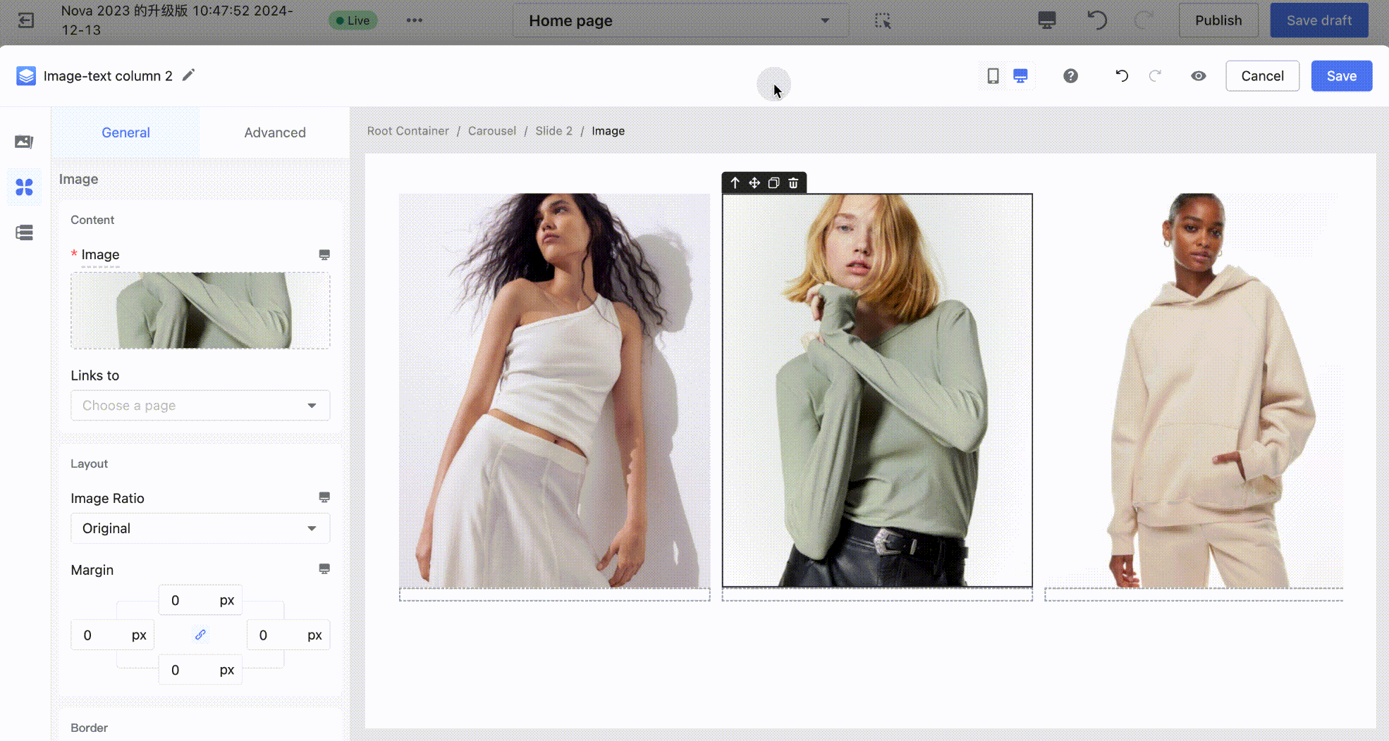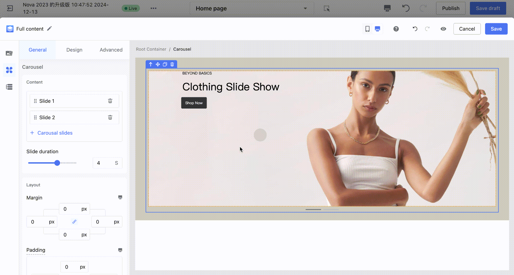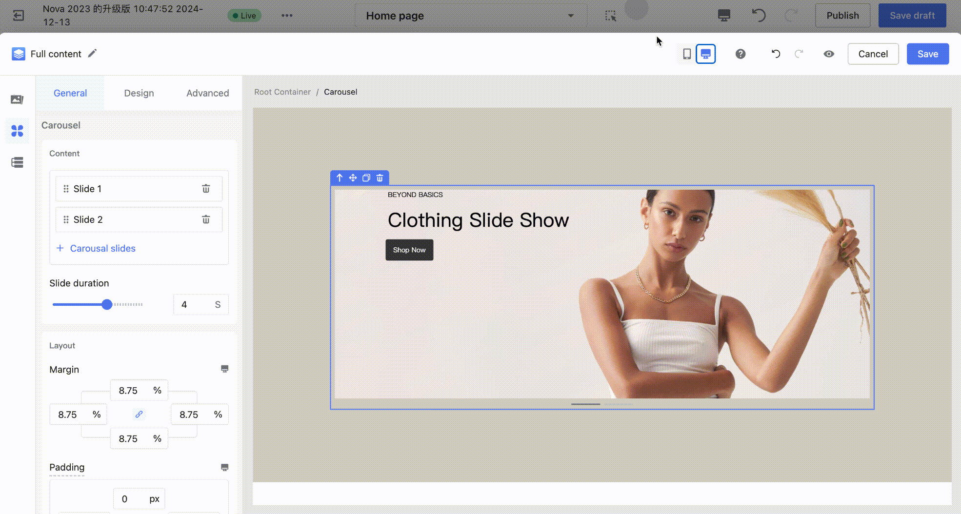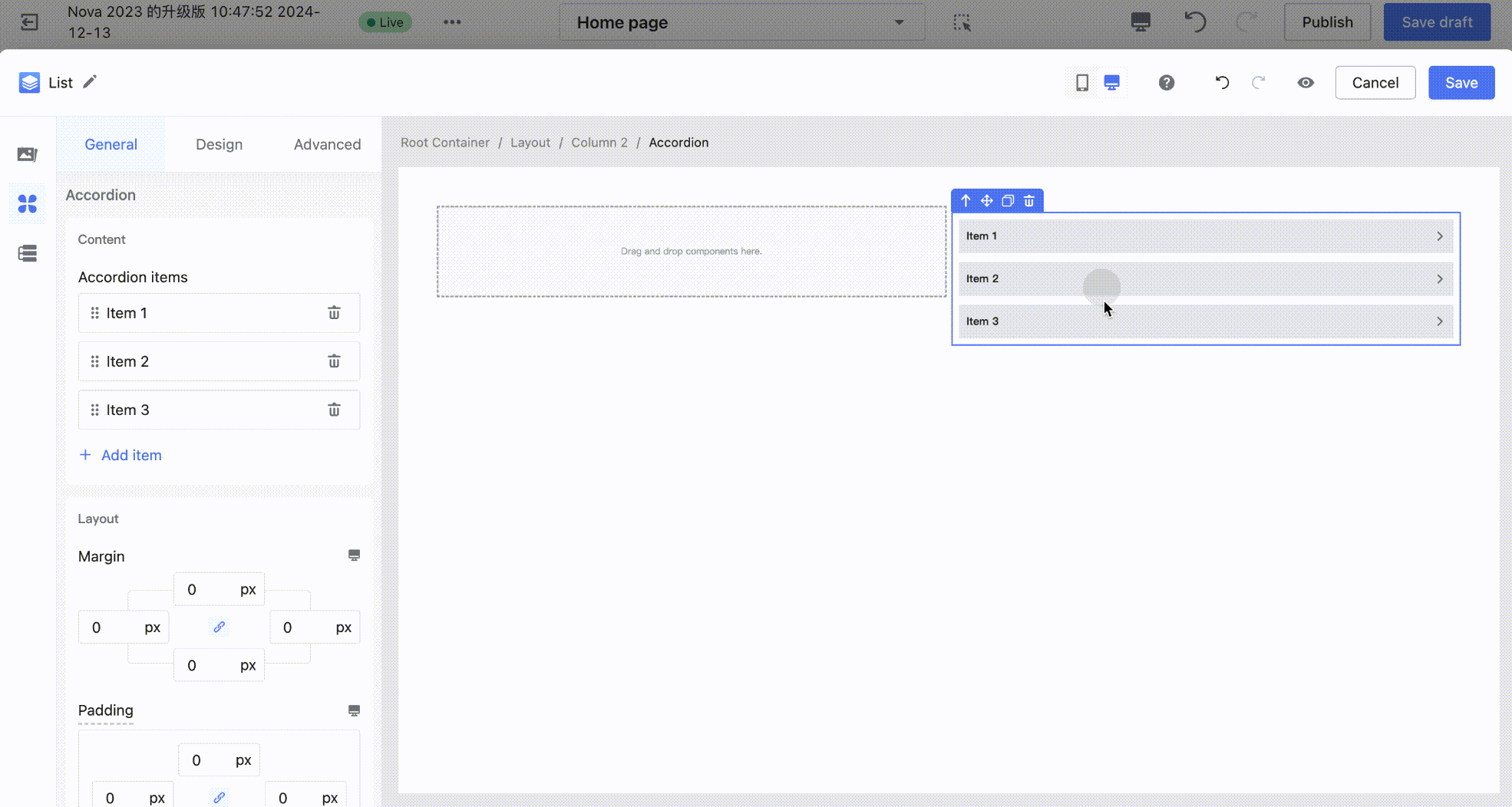 Spacing Adjustment: For some components with list properties, such as carousel, tabs, and layout containers (multiple columns in one row), you can quickly adjust the spacing between list items.