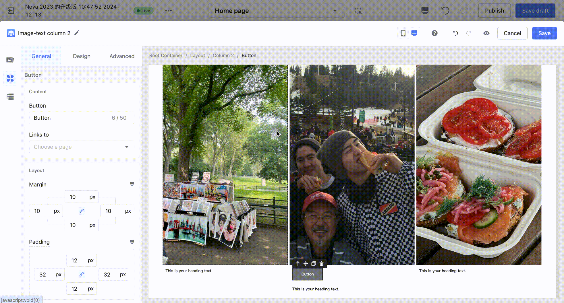 - First, build one image-text column. Then click the copy button in the upper left corner to duplicate the same sub-container on the right side, and simply modify the content for other layouts.