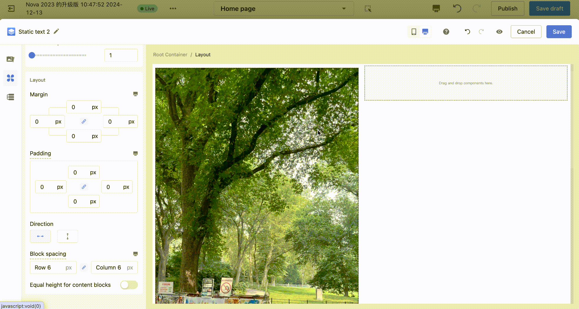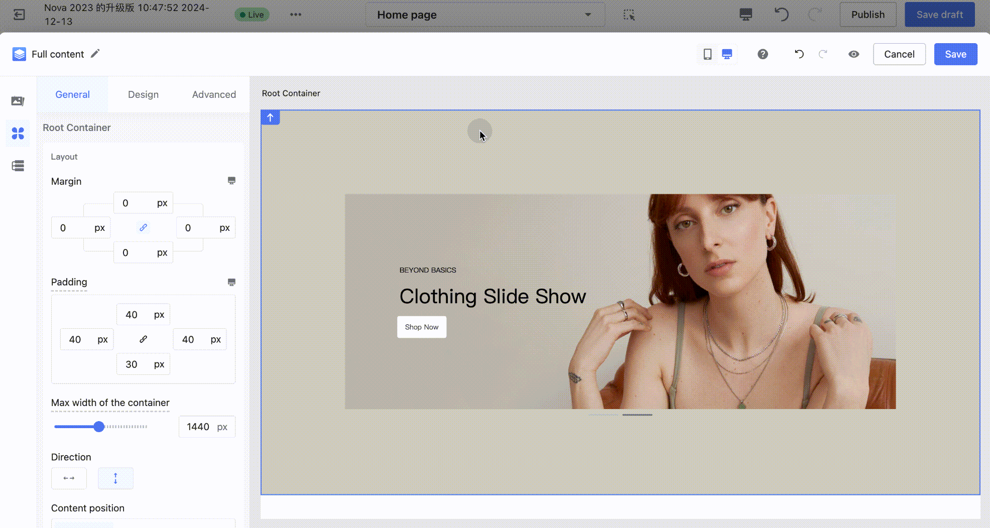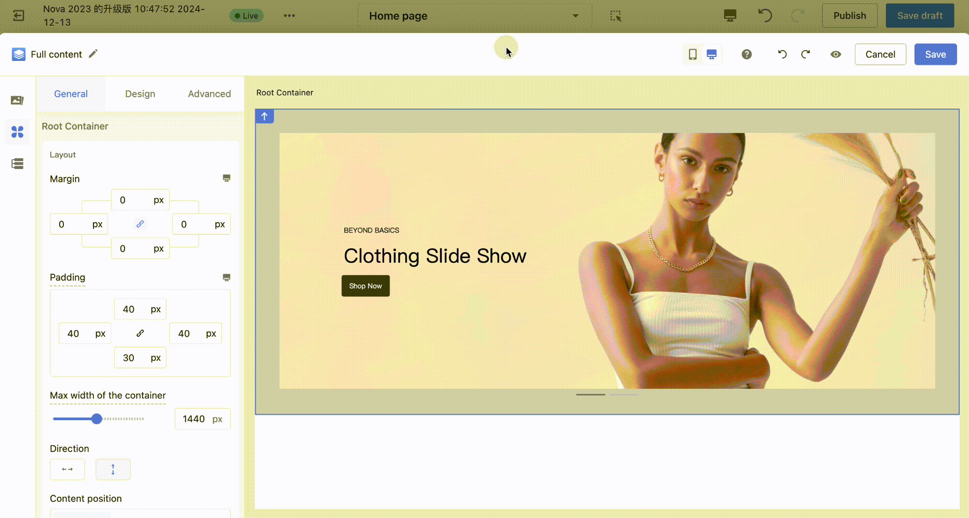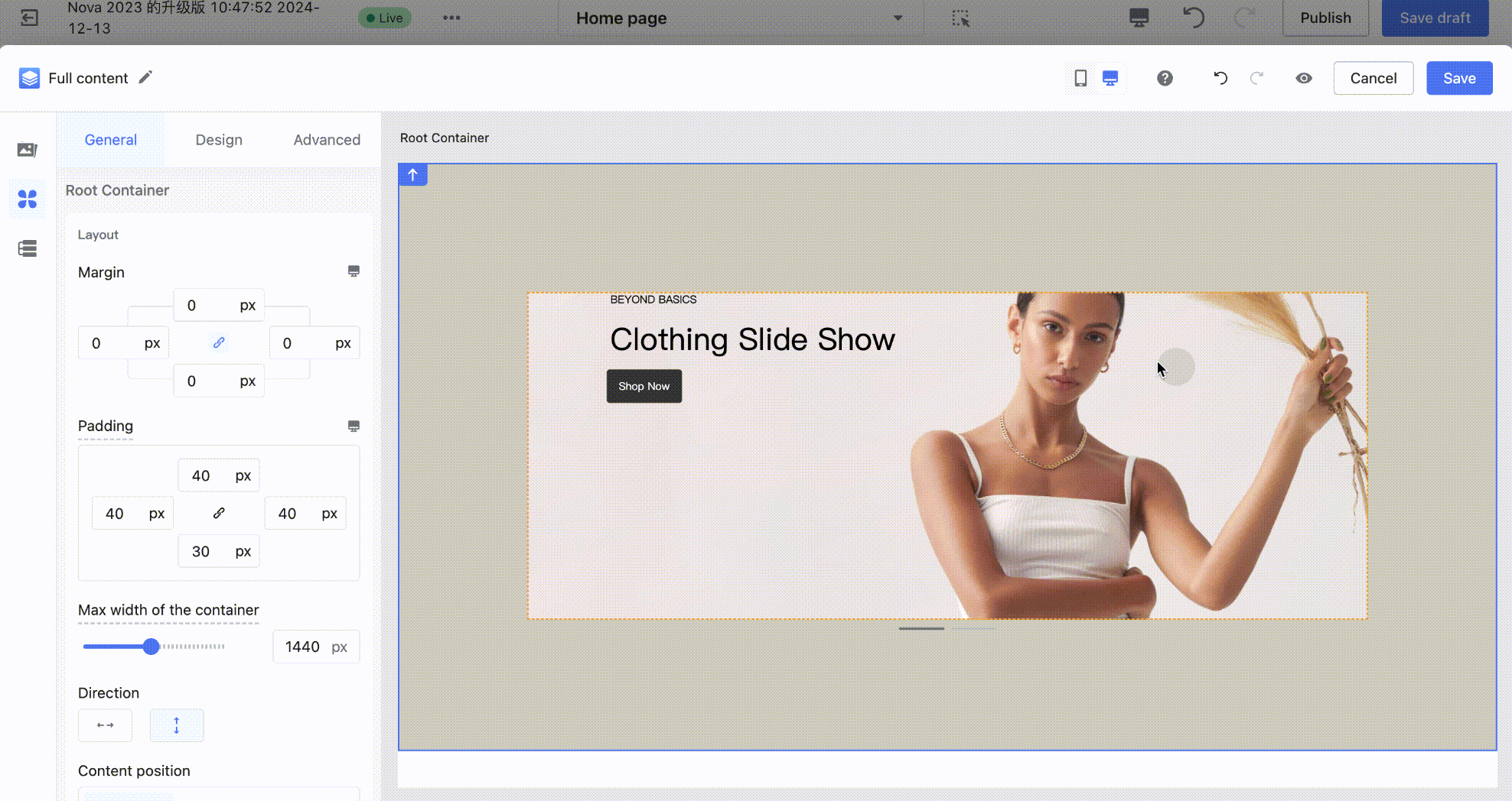 - Different design scenarios: Some scenarios require full-width display, such as banner posters. In this case, set the outermost container’s left and right padding to 0 (as shown below).