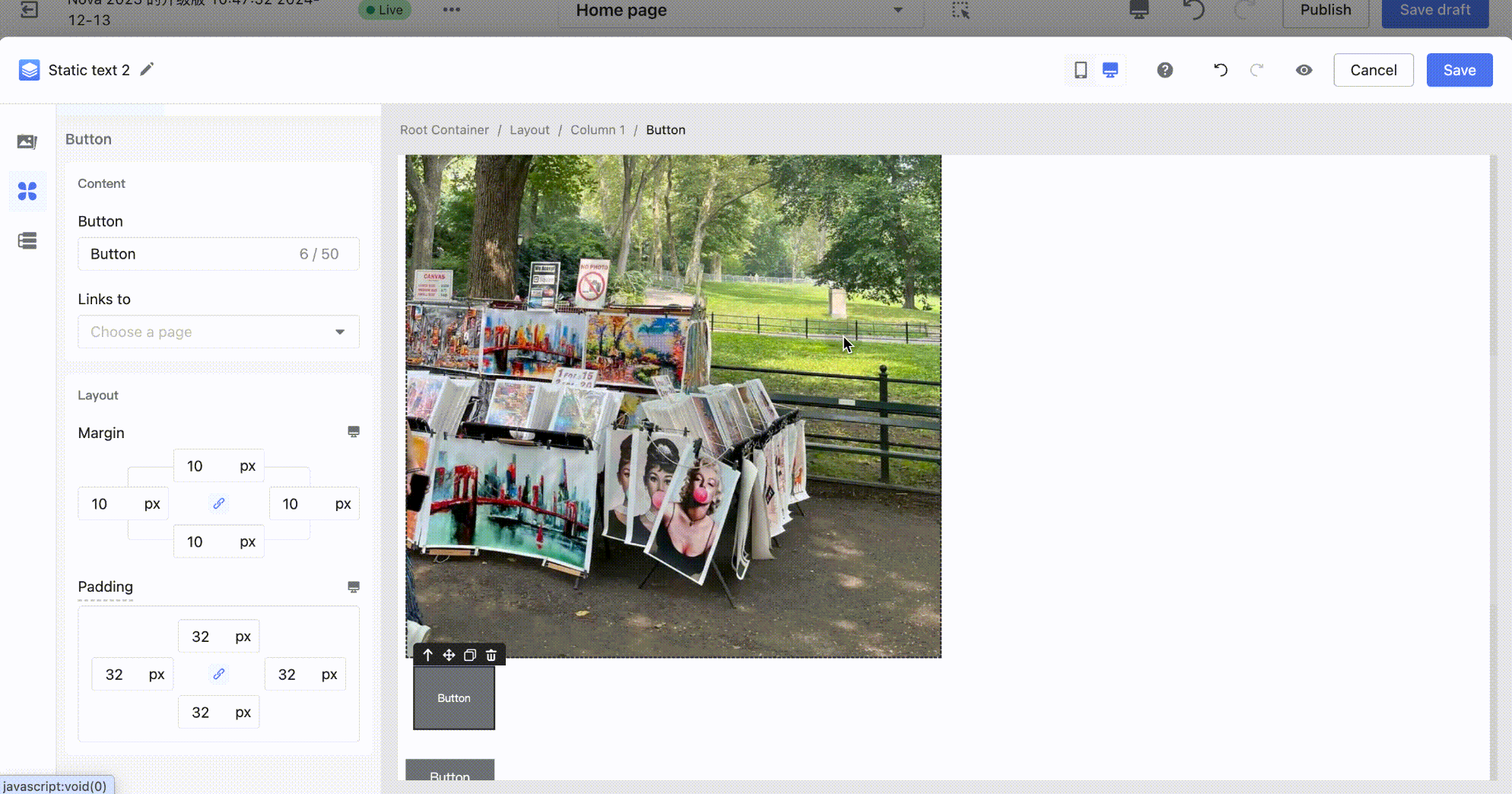 - Padding Adjustment: Padding refers to the distance between the component border and its content. It also determines the range of content that can be displayed within the component. By adjusting the padding, you can control the amount of spacing (white space) between the content and the component border.