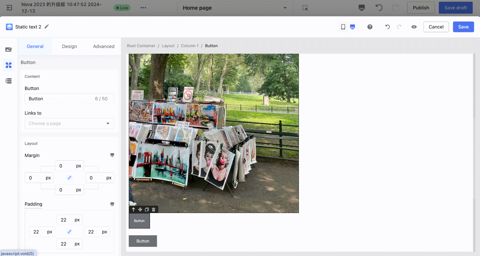 When configuring cards where some text floats on top of an image, we usually use the image to fill the container background, then drag components such as buttons and text into the container and position them at the desired location, as shown in the image below: