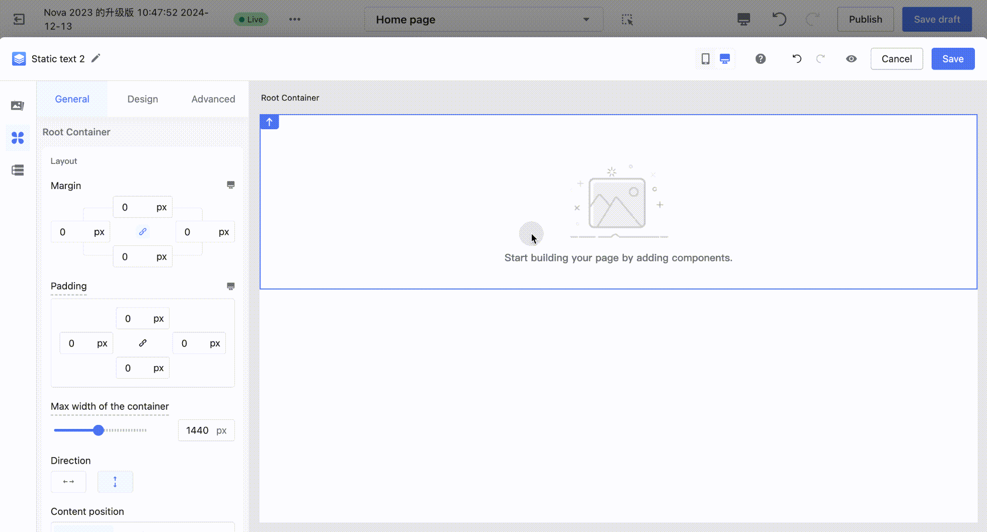 A: Container components are structured with two layers of boxes. When dragging a component onto the canvas, the reserved padding is only for easier selection and editing in the editor—it will not be displayed on the live site (C-end). Therefore, the padding and margin values are 0 by default, and the style will only take effect on the live site after manually inputting the desired values.