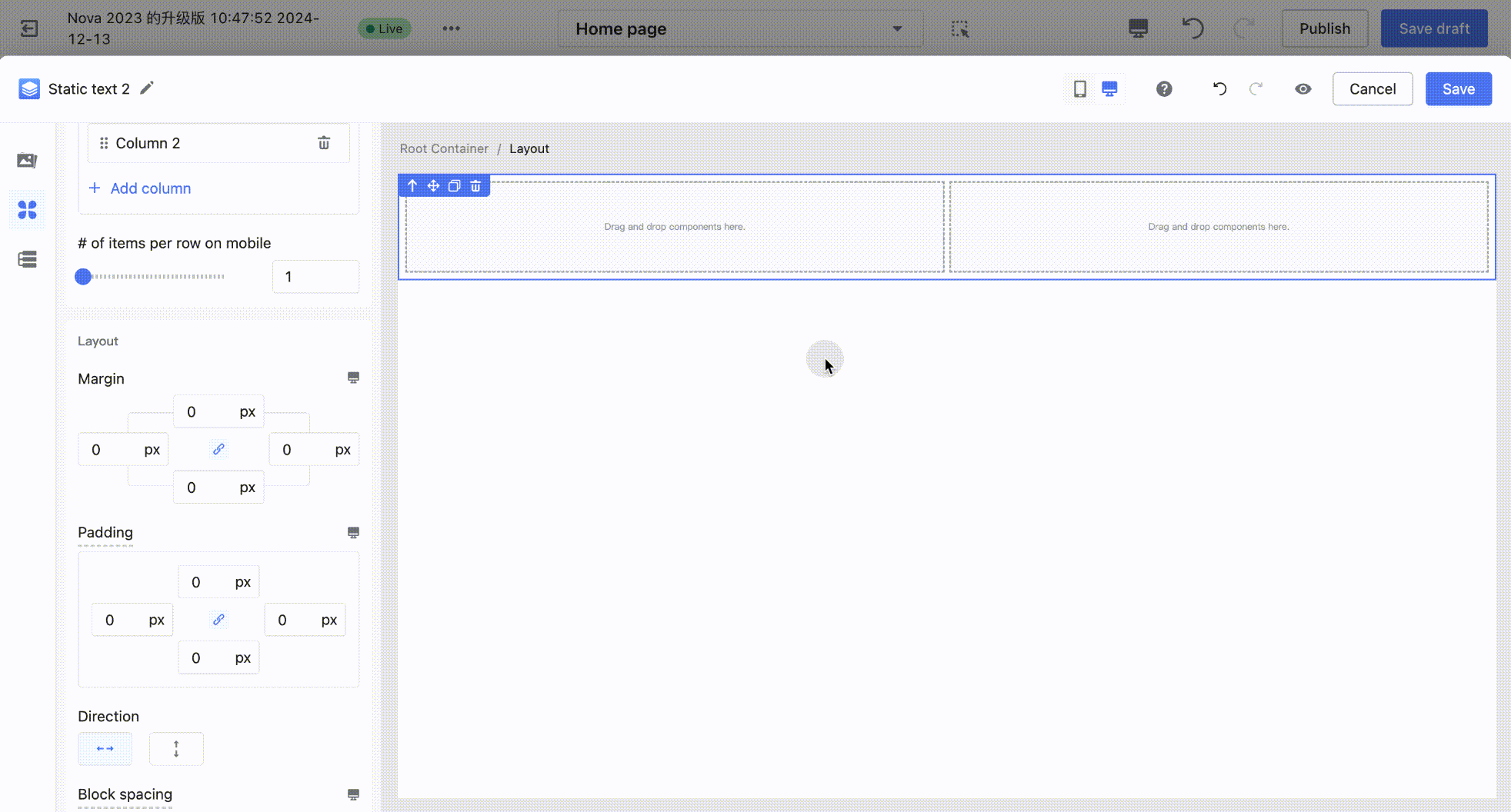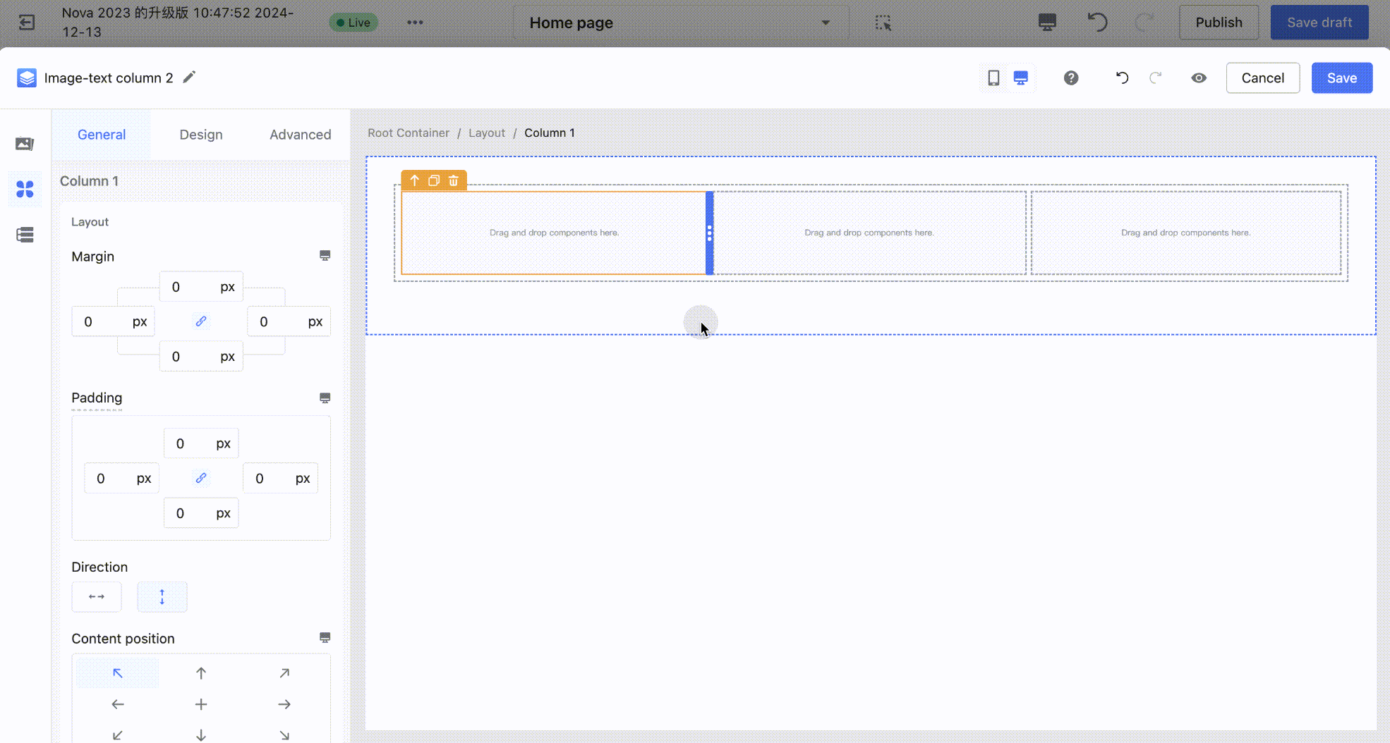 - Step 2: Adjust the arrangement direction of the sub-containers according to the content layout, and drag the content into each column’s sub-container in order.