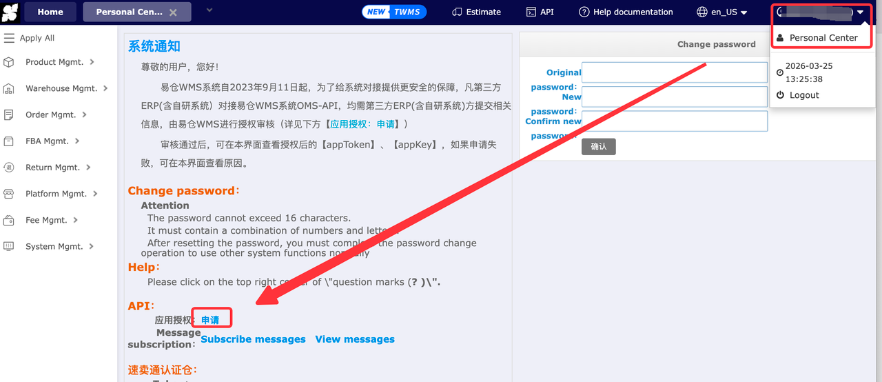 1. Log in to the Warehouse & Logistics System and click Personal Center in the upper-right corner.