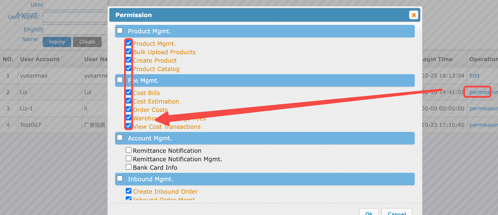 5. Click Permission and select the required permissions for the sub-account.