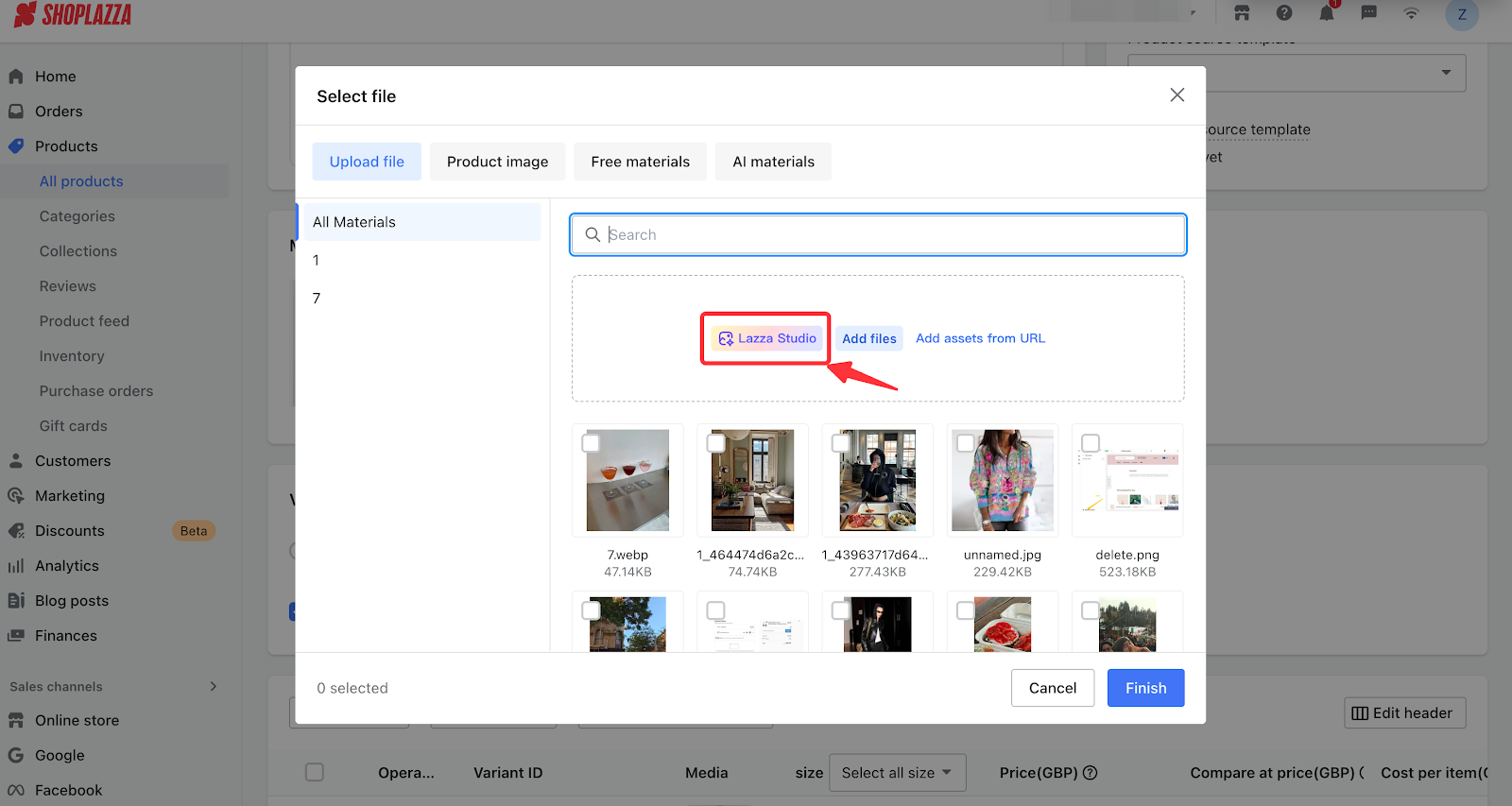 1. Log in to your Shoplazza Admin dashboard, navigate to the Products section, and click on the corresponding product to enter the Product Editing Page. Scroll down to the Product Media section and click Add Media. In the media selection popup, click Lazza Studio to access the platform interface.