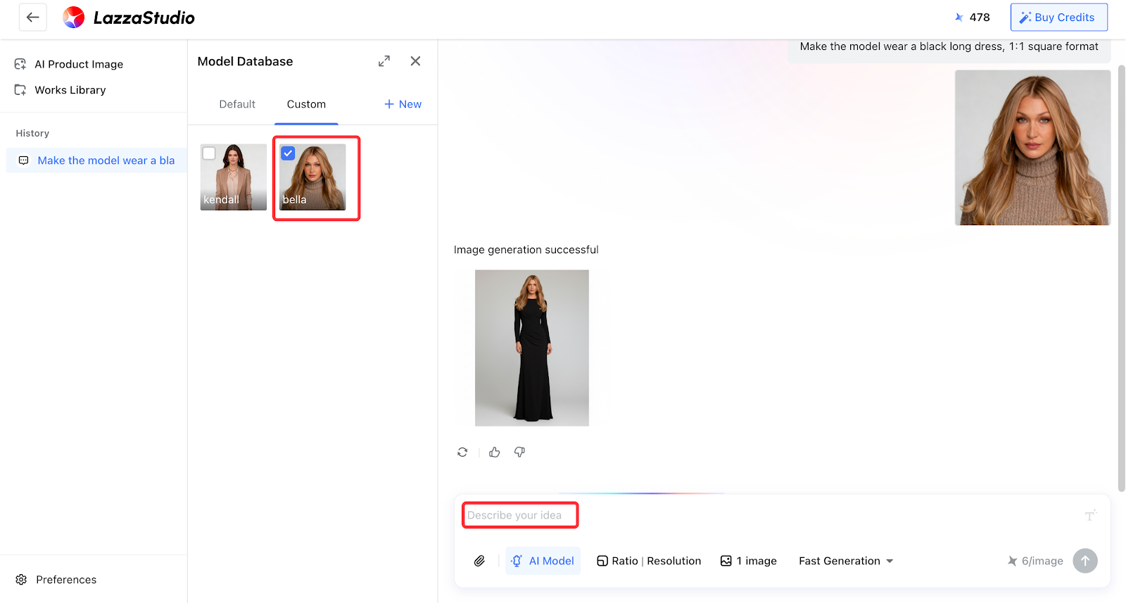2. Use a Model: After selecting a model in AI Model, you can reference the model in the prompt input field as a source for image generation. This is applicable for scenarios such as AI try-on, poster creation, and other visual content generation.
