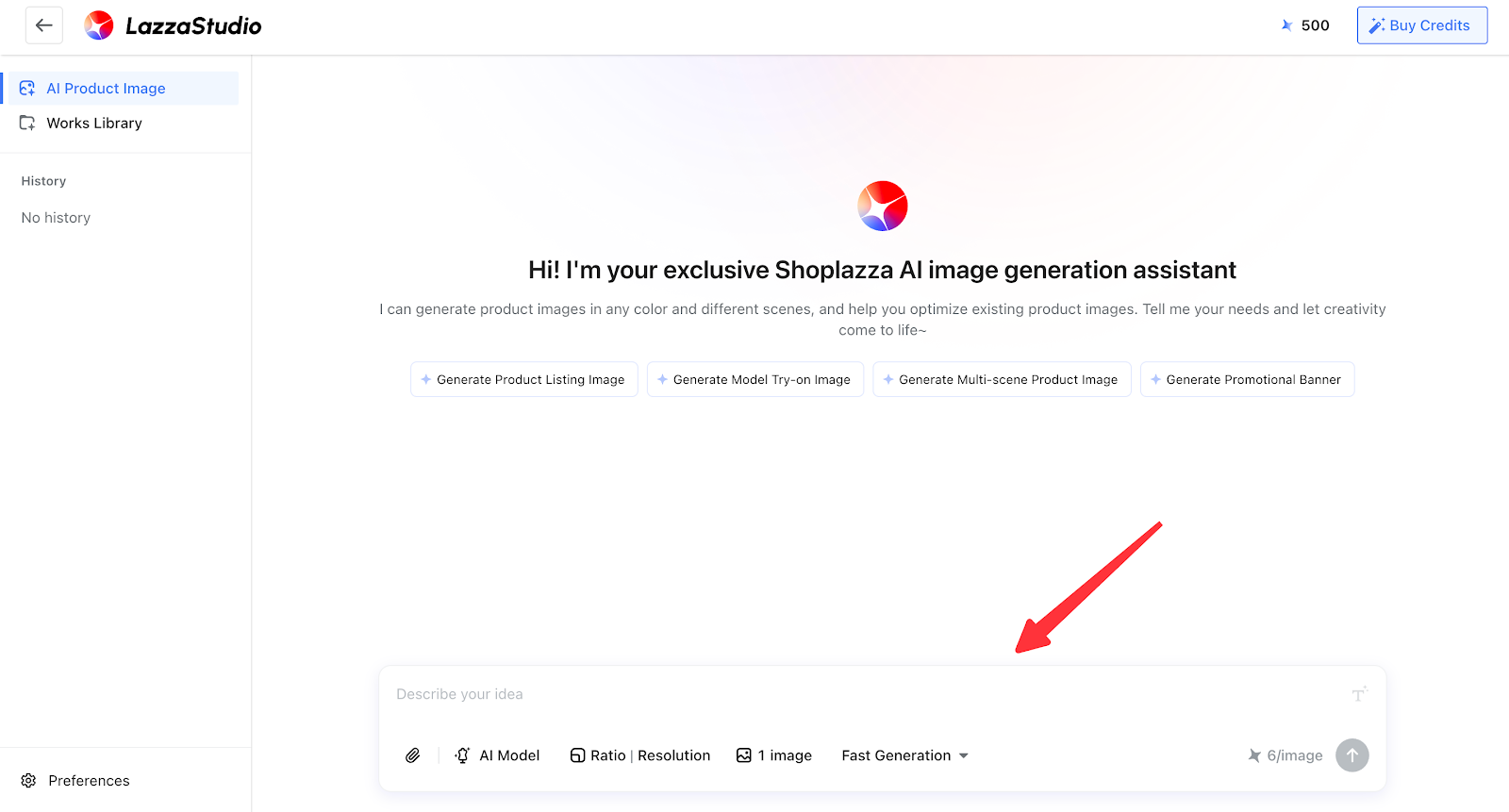 With AI Product Images, you can generate the product visuals you need through conversational prompts. Examples include images for product listing pages (such as AI model try-on images, white background images, color variation images, and lifestyle scene images), website design assets, promotional banner images for discount pages, and creatives for social media advertising. Click AI Product Images to start a new conversation and begin a new image generation workflow.