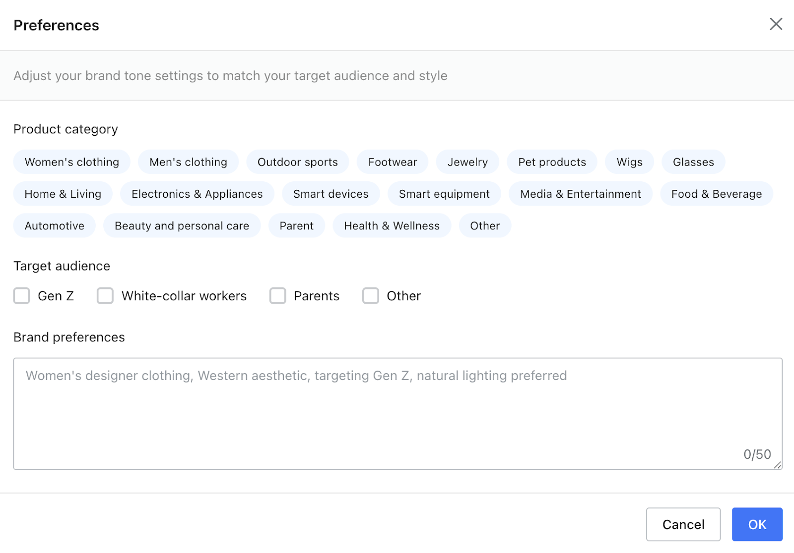 You can set your brand tone, category, target audience, and brand preferences. Once configured, we will save them in Lazza Studio, and future generated images will follow the preferences you’ve set.