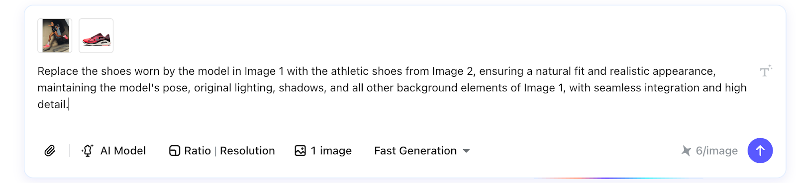 Replace the shoes on the model in Image 1 with the shoes shown in Image 2, ensuring that the shoes fit naturally on the model’s feet. Maintain consistent lighting, perspective, proportions, and depth with the original image. At the same time, keep the model’s pose, body structure, background, and all other elements identical to Image 1. The replaced area should have no visible seams, and the final image should exhibit realistic material, clear details, and high-fidelity professional photography quality. | ![]() ![]() | 1. Number of images: 1 2. Aspect Ratio & Resolution: 9:16; 2K 3. Mode: Professional Studio (Nanobanana Pro) | ![]() |