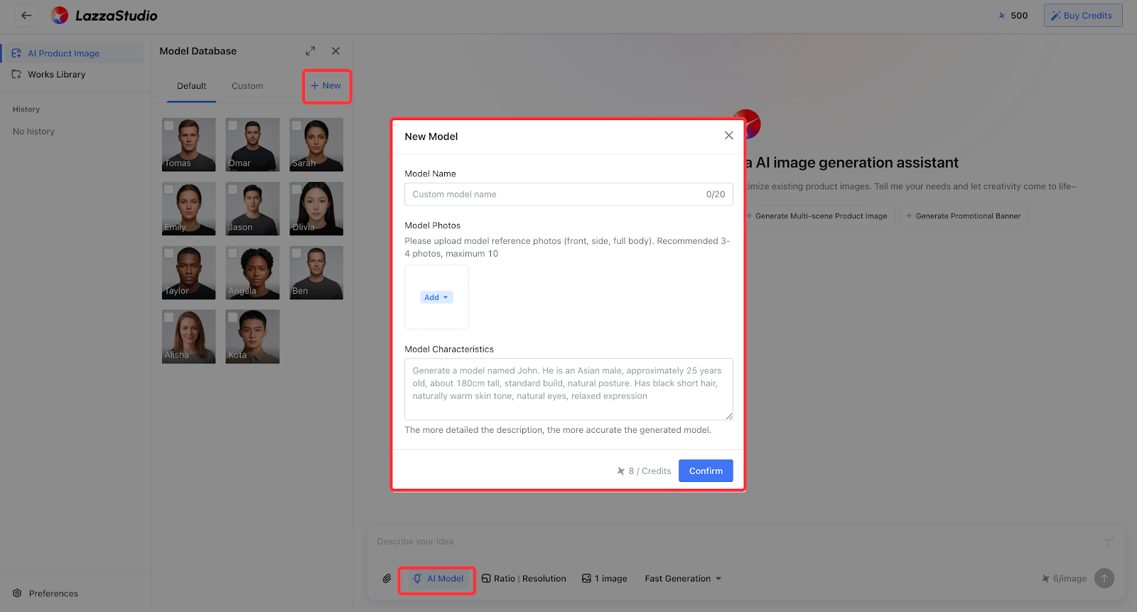 1. Create a Model: To create a model, enter the model name and upload a clear frontal reference image showing the model’s facial features.