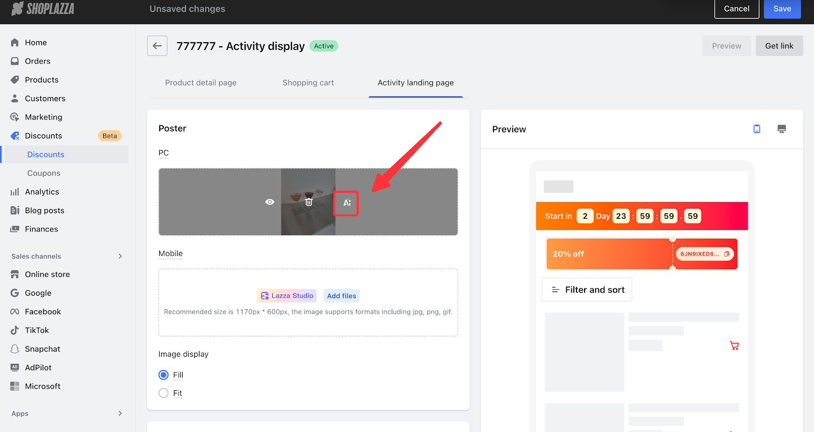 - On the Discount Design Editing Page, in sections such as Poster where images are uploaded, hover over an existing image and click AI Edit to enter the Lazza Studio interface. The selected media will be automatically loaded into Lazza Studio.
