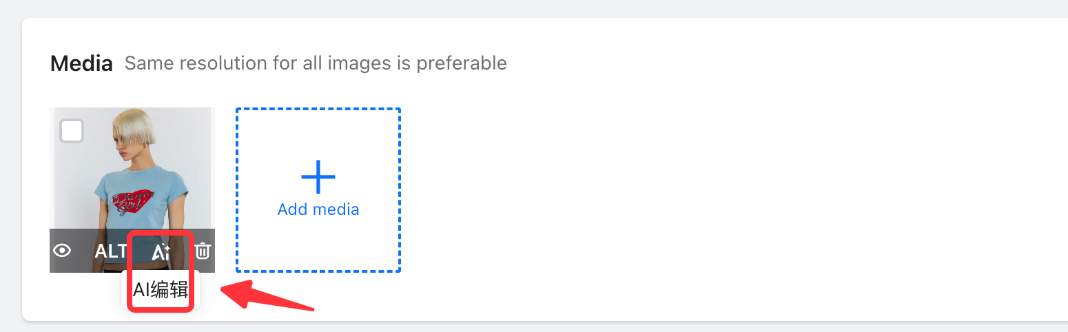 - On the Product Editing Page > Product Media section, you can hover your mouse over a media item and click AI Edit to enter the Lazza Studio interface. The selected media will be automatically loaded into Lazza Studio.