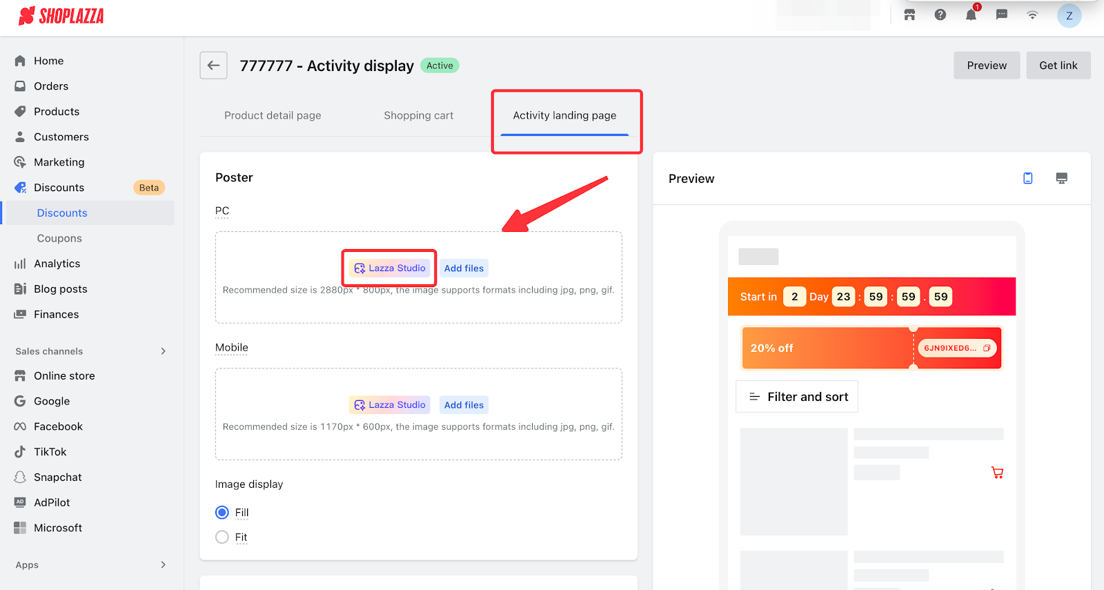 - On the Discount Design Editing Page, in sections such as Poster where you upload images, click Add File. In the media selection popup, click Lazza Studio to access the platform interface.