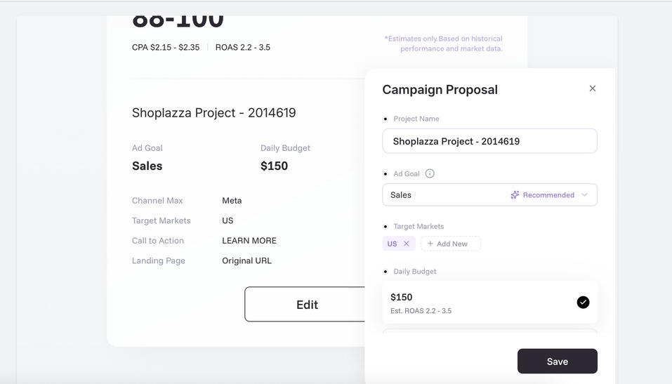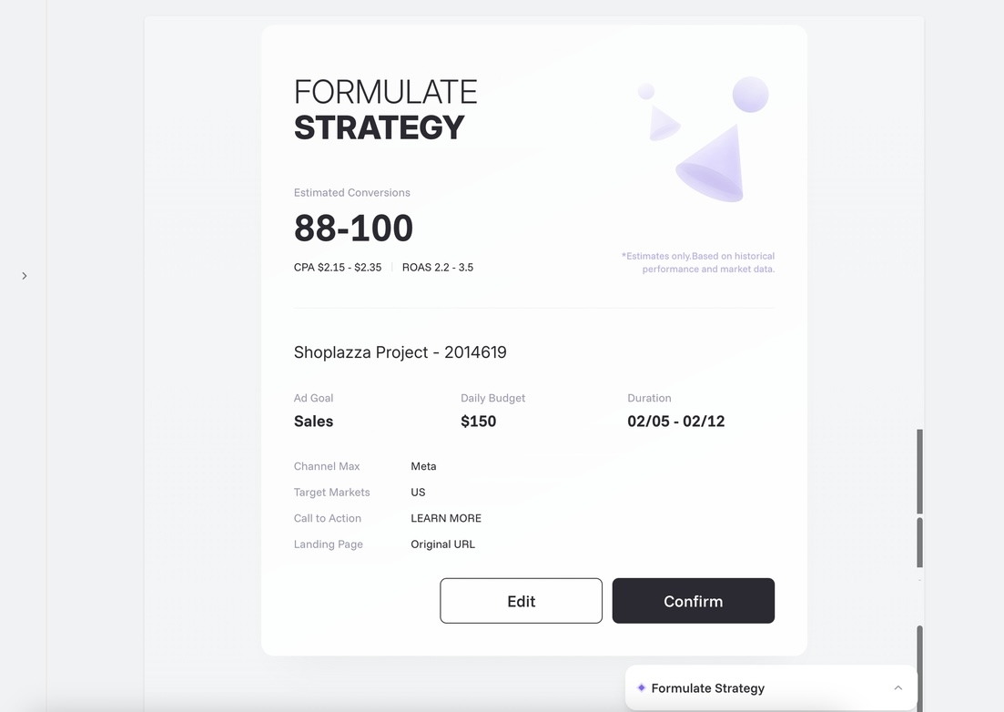 c. Generate the advertising strategy, including campaign objective, daily budget, and scheduling. You can also preview the expected ad performance here. In addition, you can click Edit to modify the advertising strategy. Click Confirm to proceed to the next step.