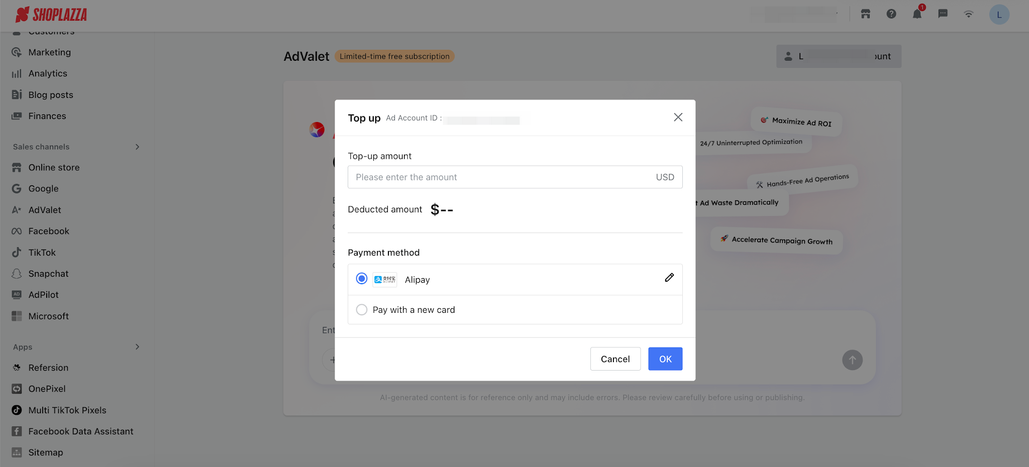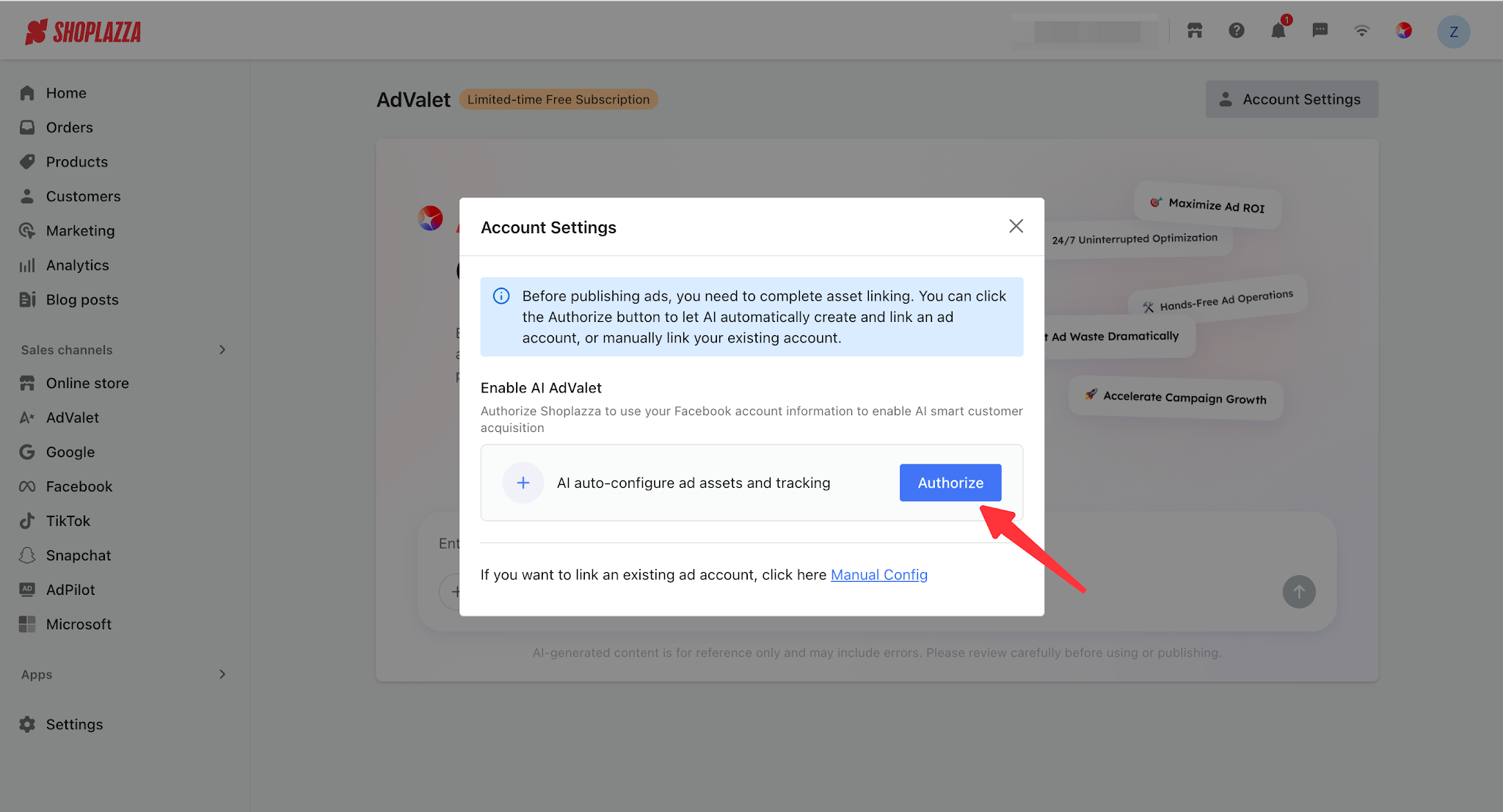 - Enable AI automatic advertising (recommended): Authorize Shoplazza to use your Facebook information, allowing AI to automatically configure assets and tracking. The process is as follows: