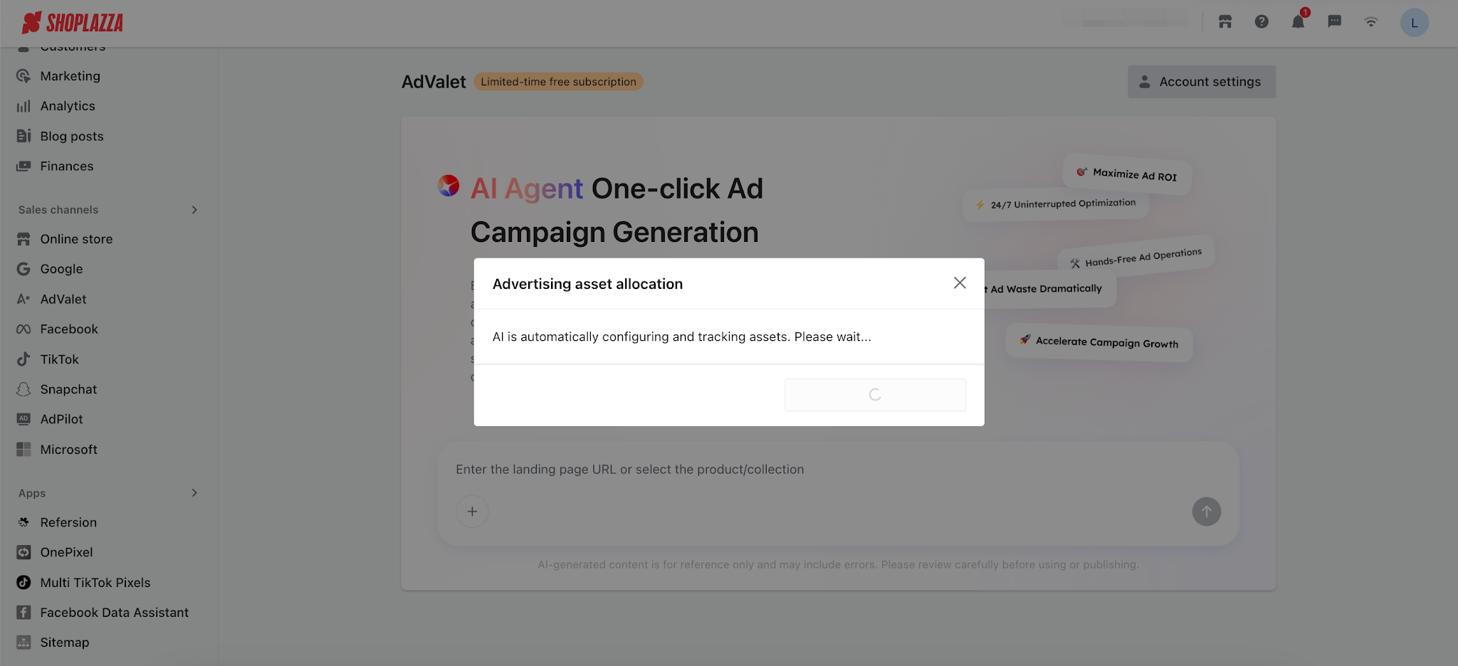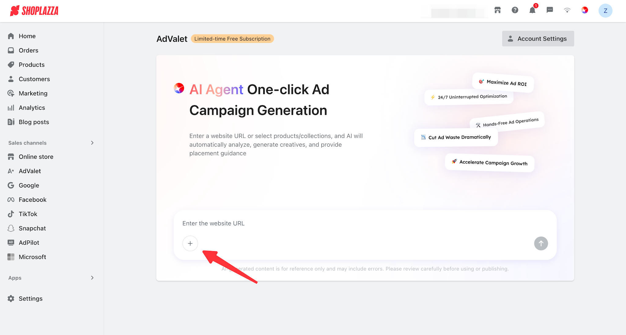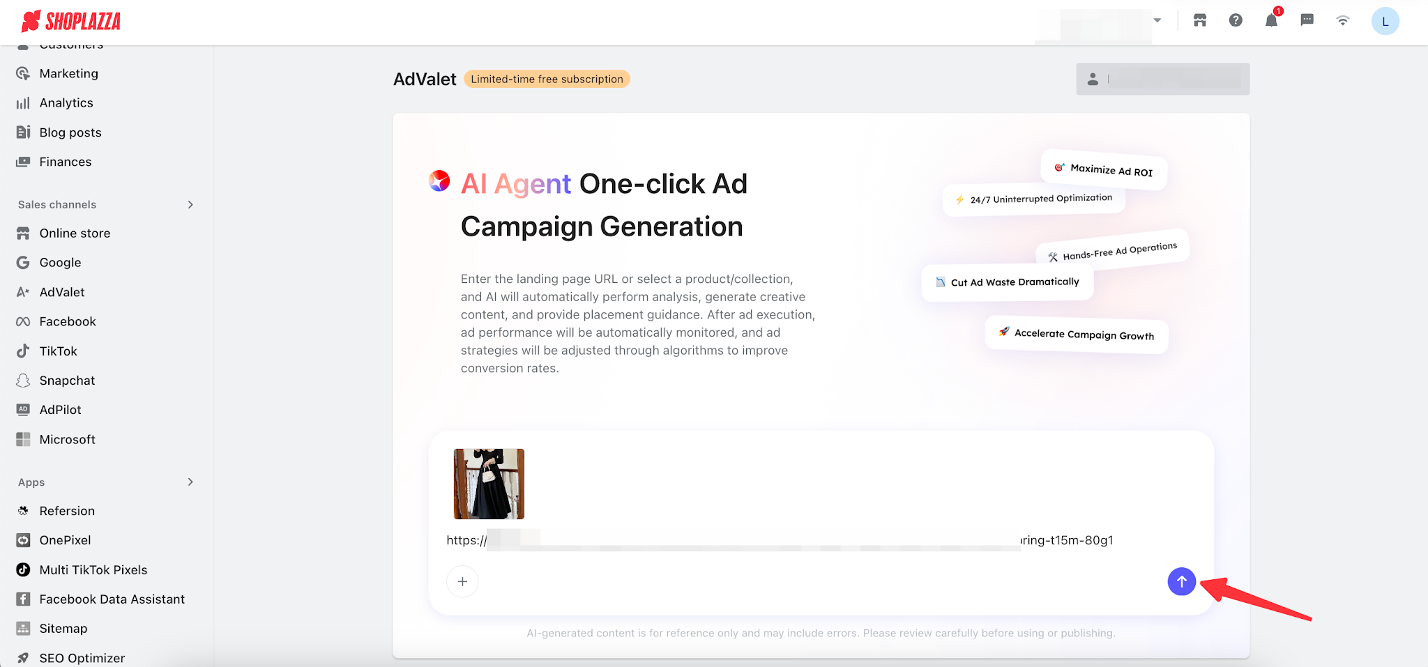 1. One-click campaign creation: Simply enter a website URL or select specific products/collections, and AI will automatically perform full-funnel analysis and generate ad creatives.
