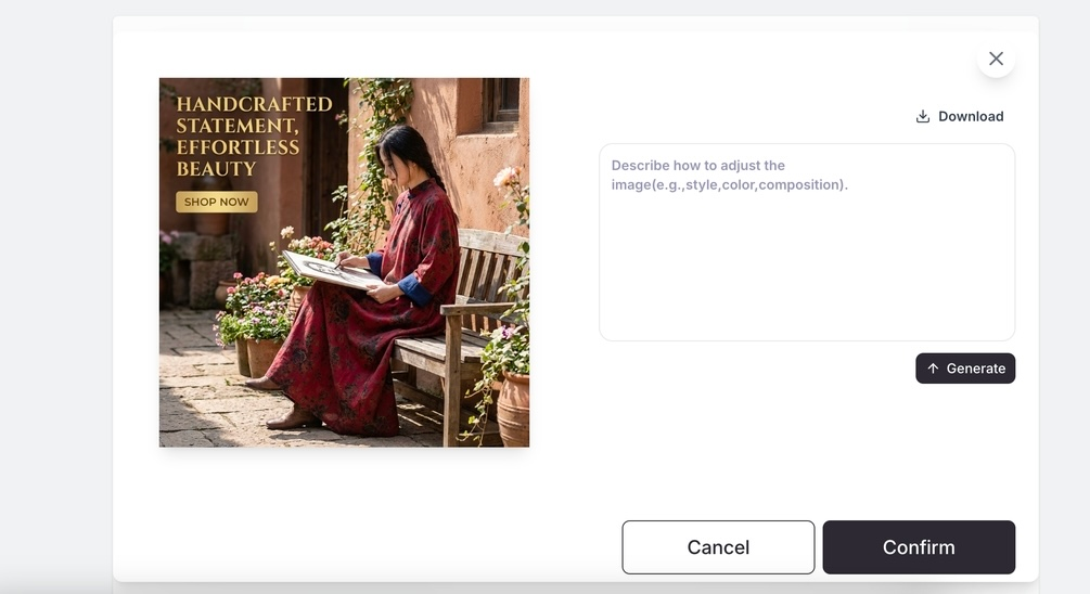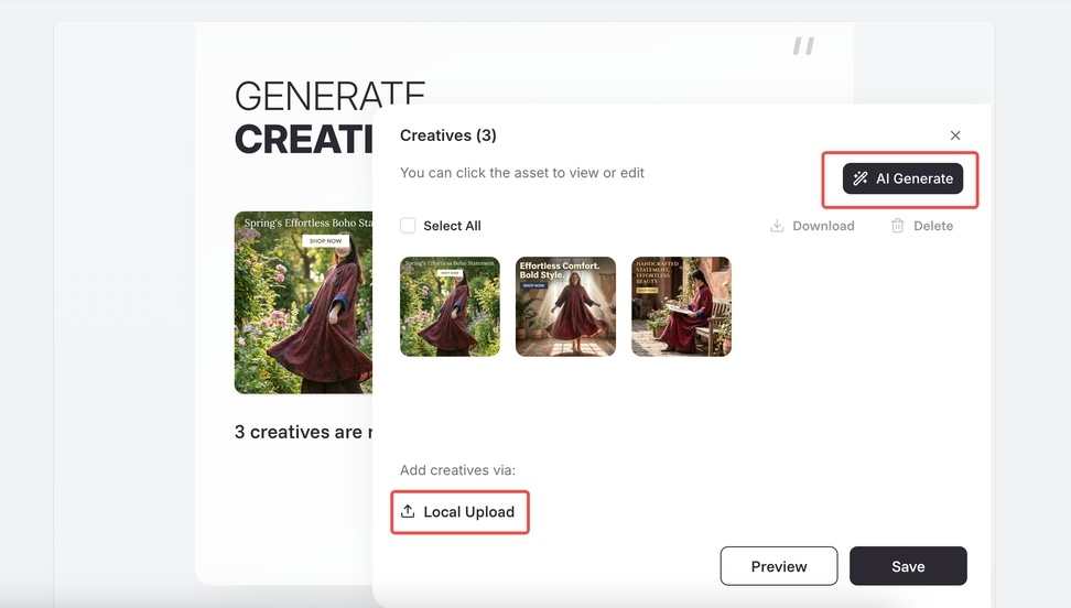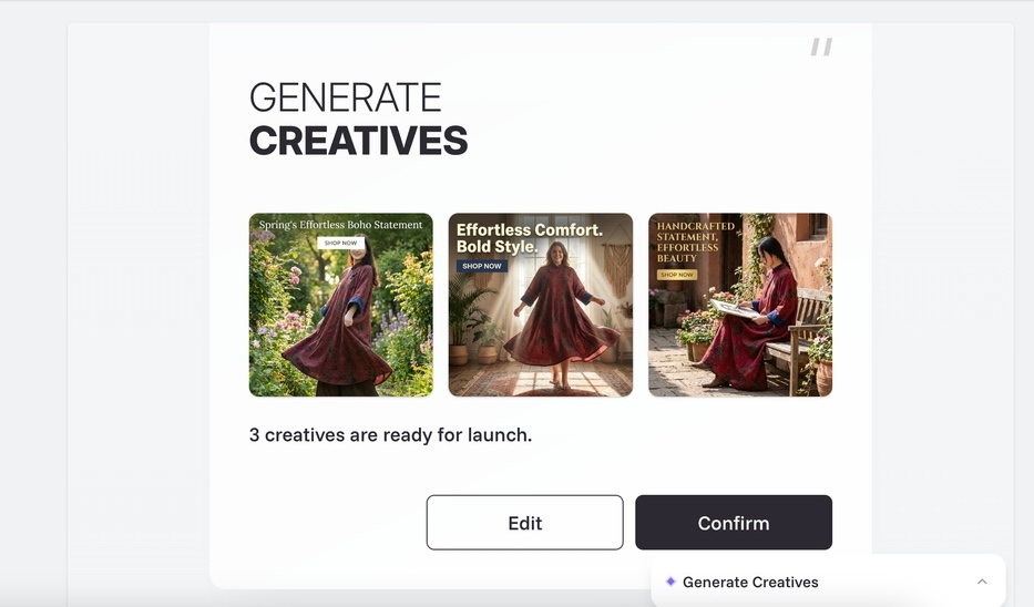 d. Generate ad creatives: we will create 3 ad assets for you. You can also click [Edit] to make adjustments to the creatives.
