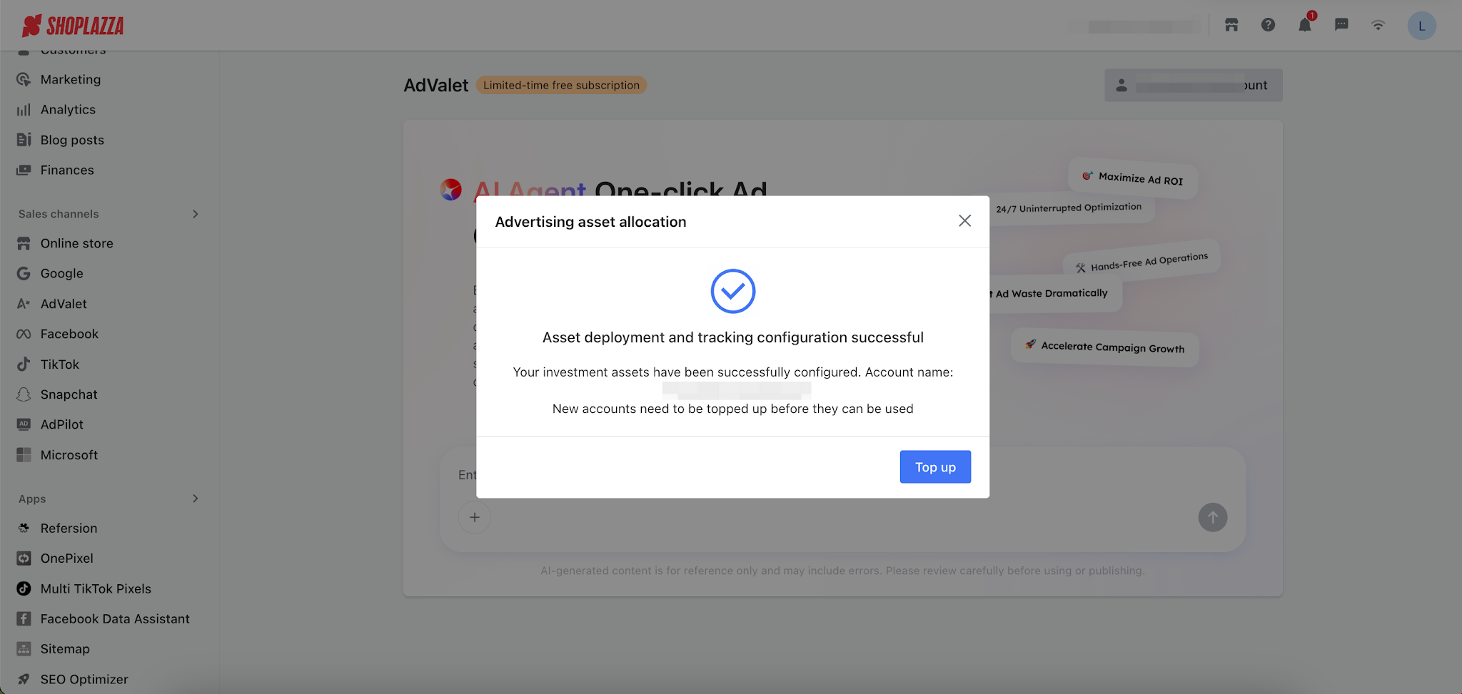 3. After the connection is completed, if you are using a newly created account, you will need to click [Top Up] to add funds to your ad account balance.