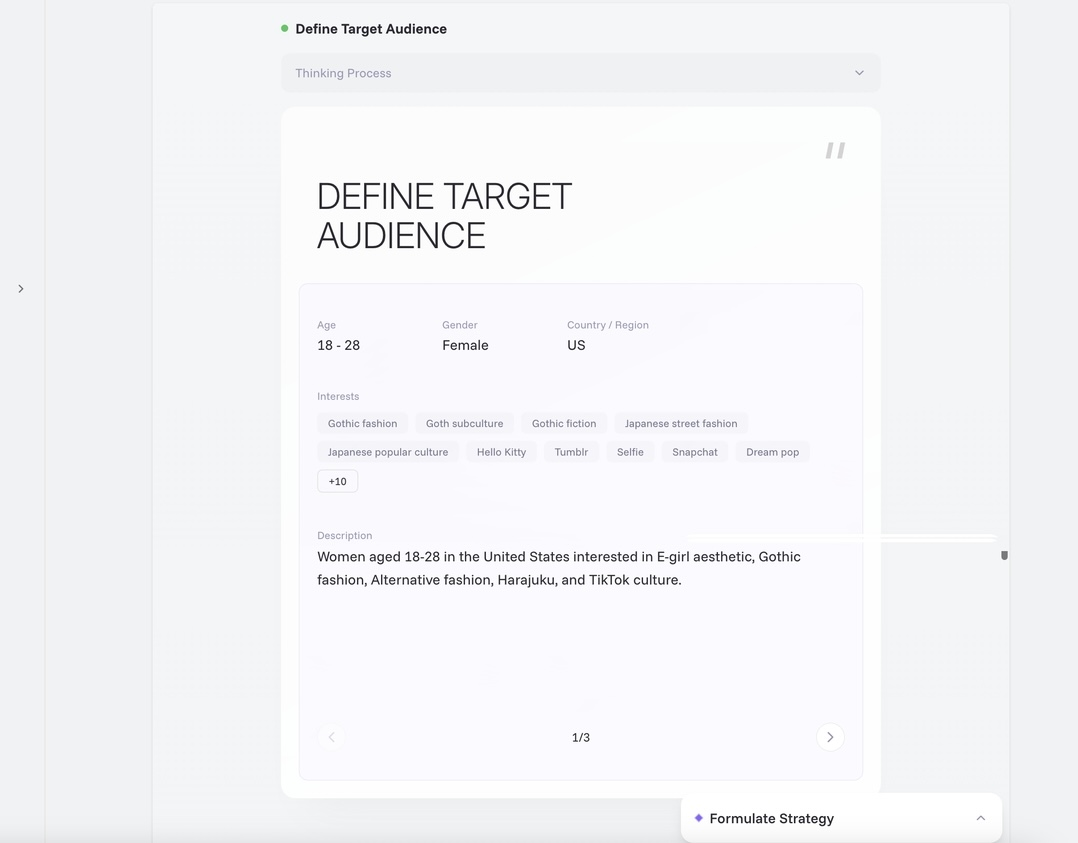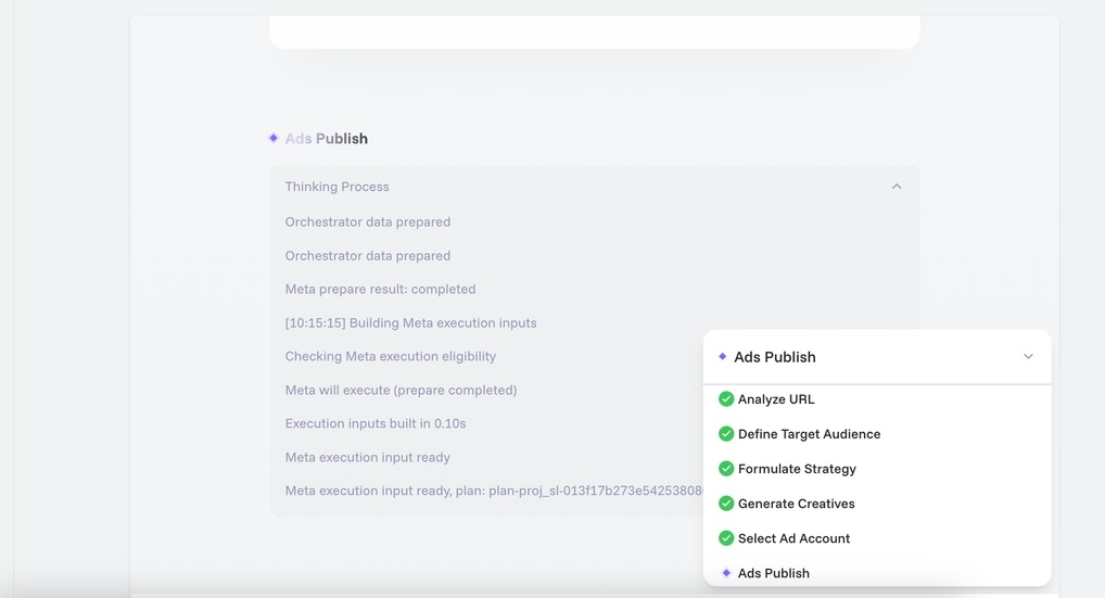 3. The ad creation process will automatically follow the steps below. You can preview the AI-generated audience, strategy, creatives, and more: