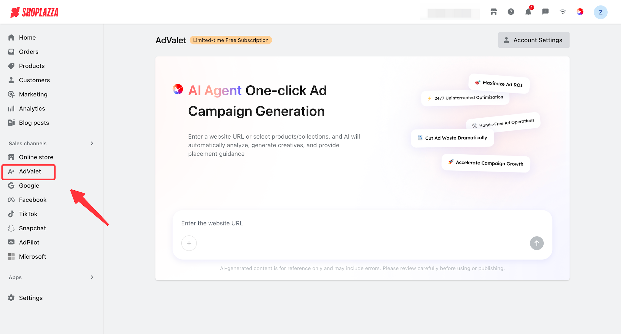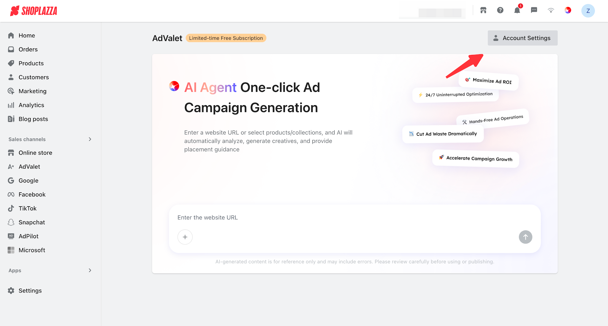 1. When entering AdValet for the first time, click Account Settings in the upper right corner of the page.