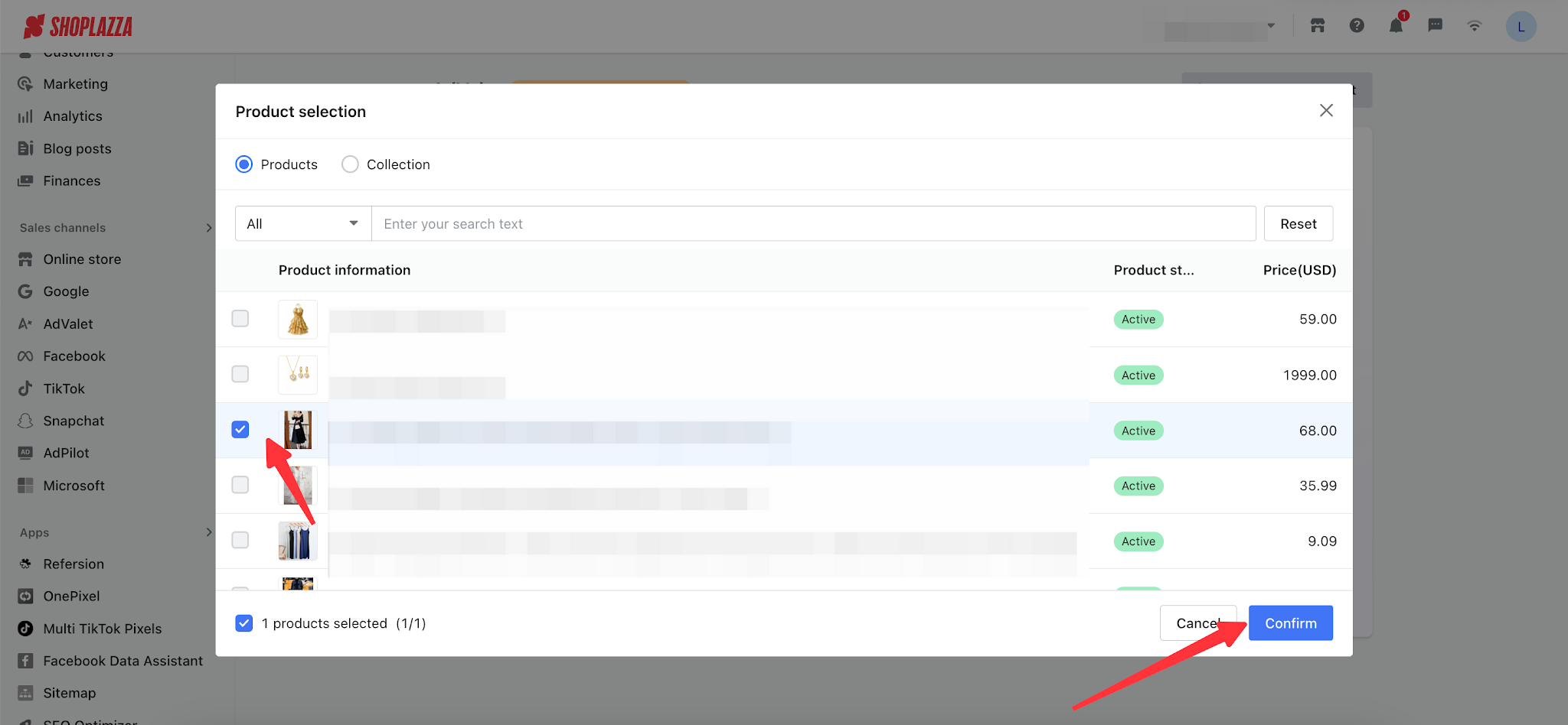 - Select a product or collection: Click the button to open a pop-up window and select one SPU (product) or one collection from your store list.