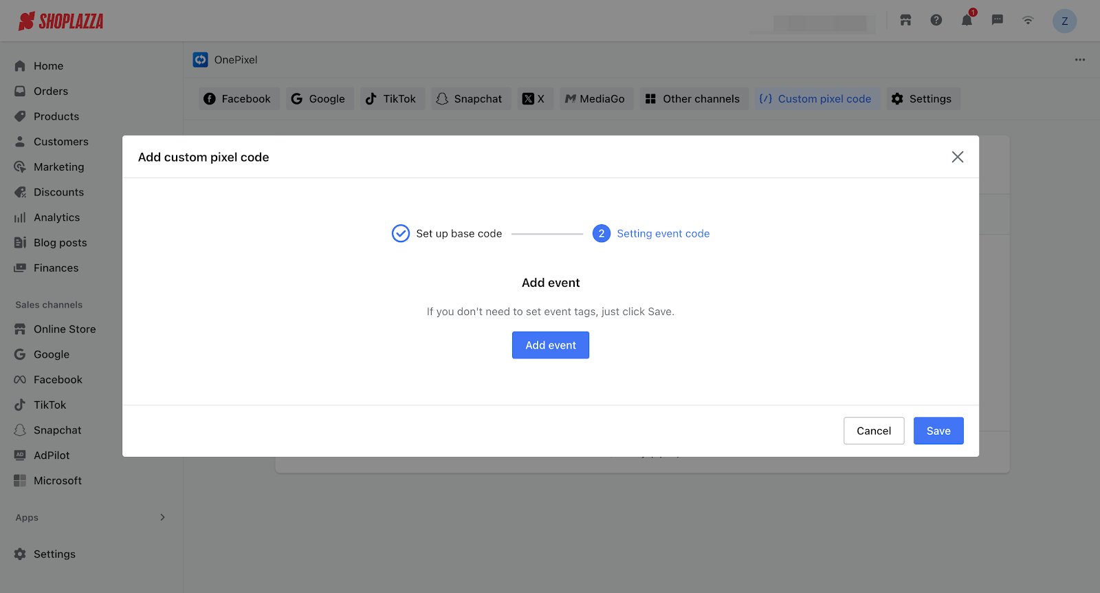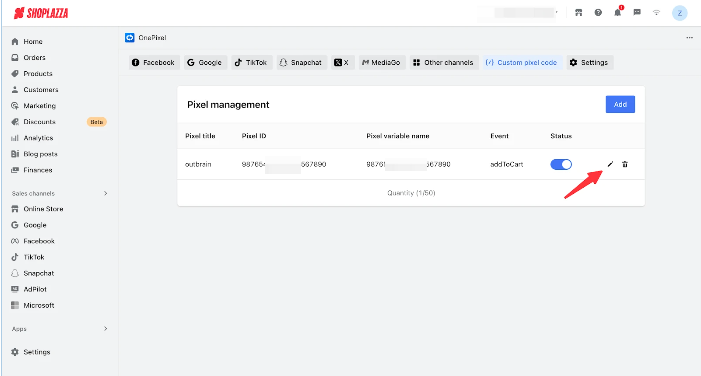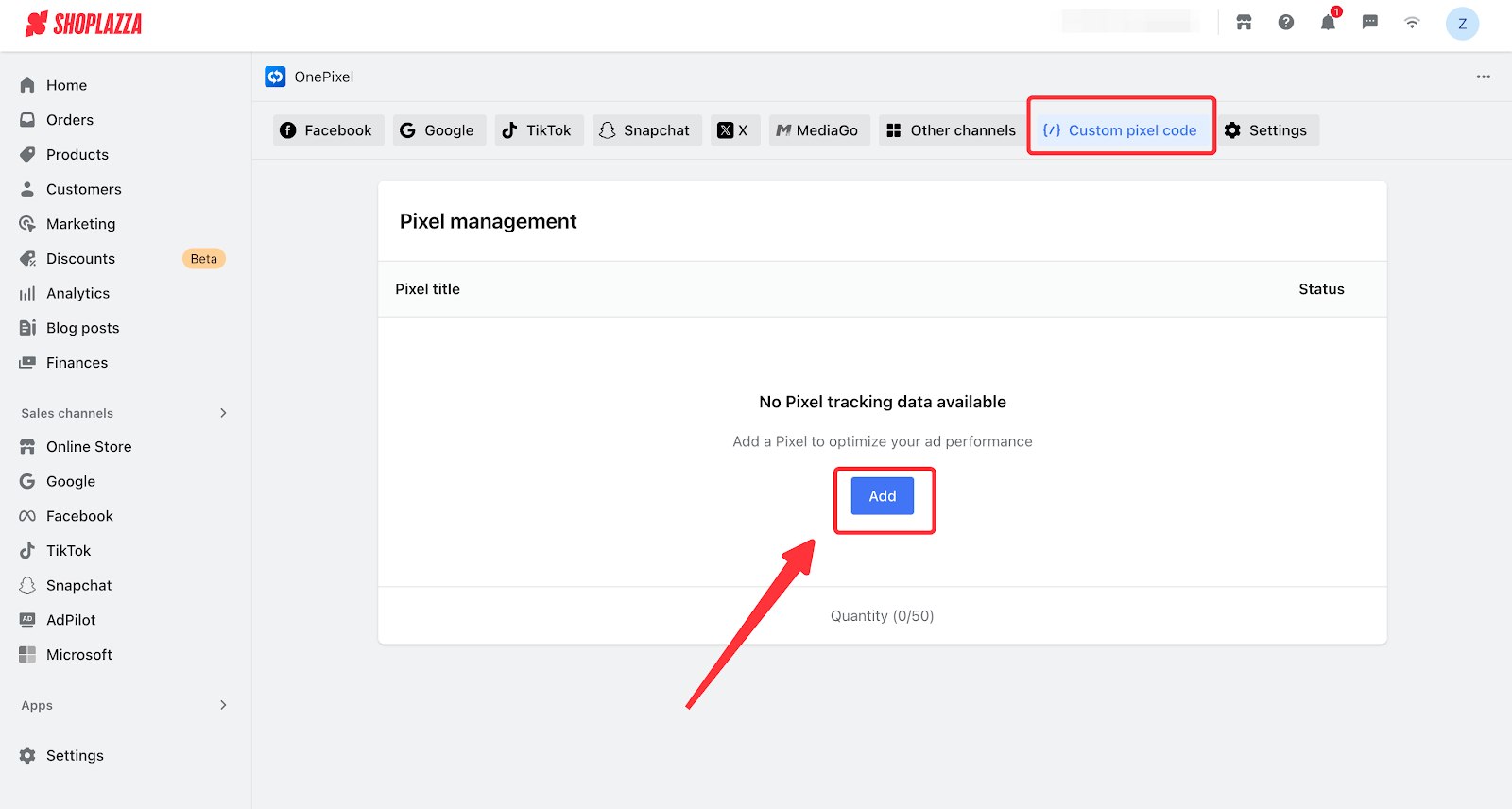 3. Go to the Shoplazza admin > Apps > One Pixel. Select Custom Pixel Code and click the Add button.