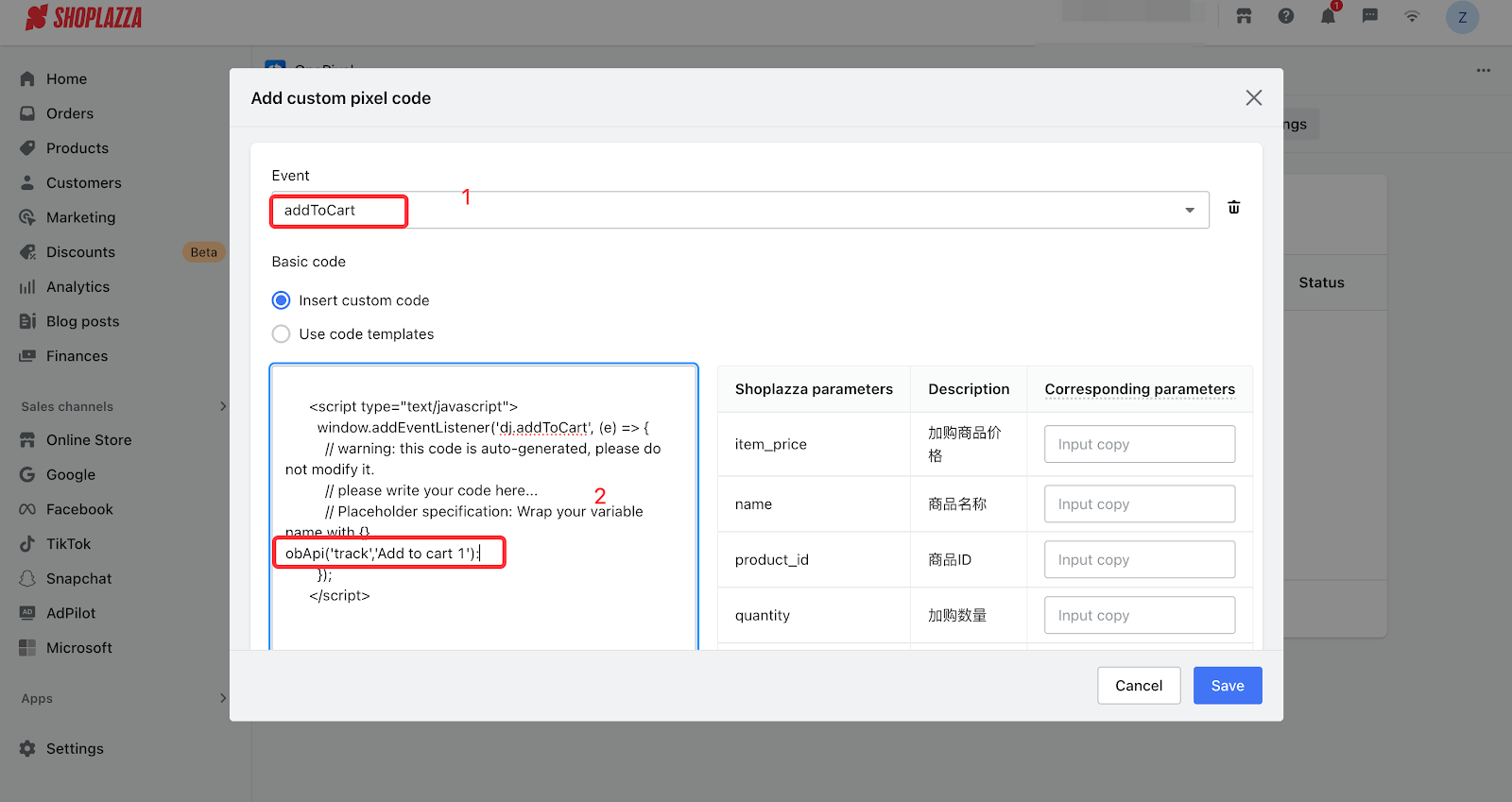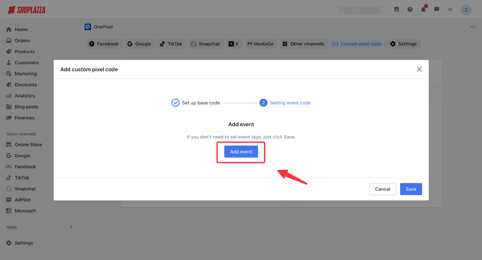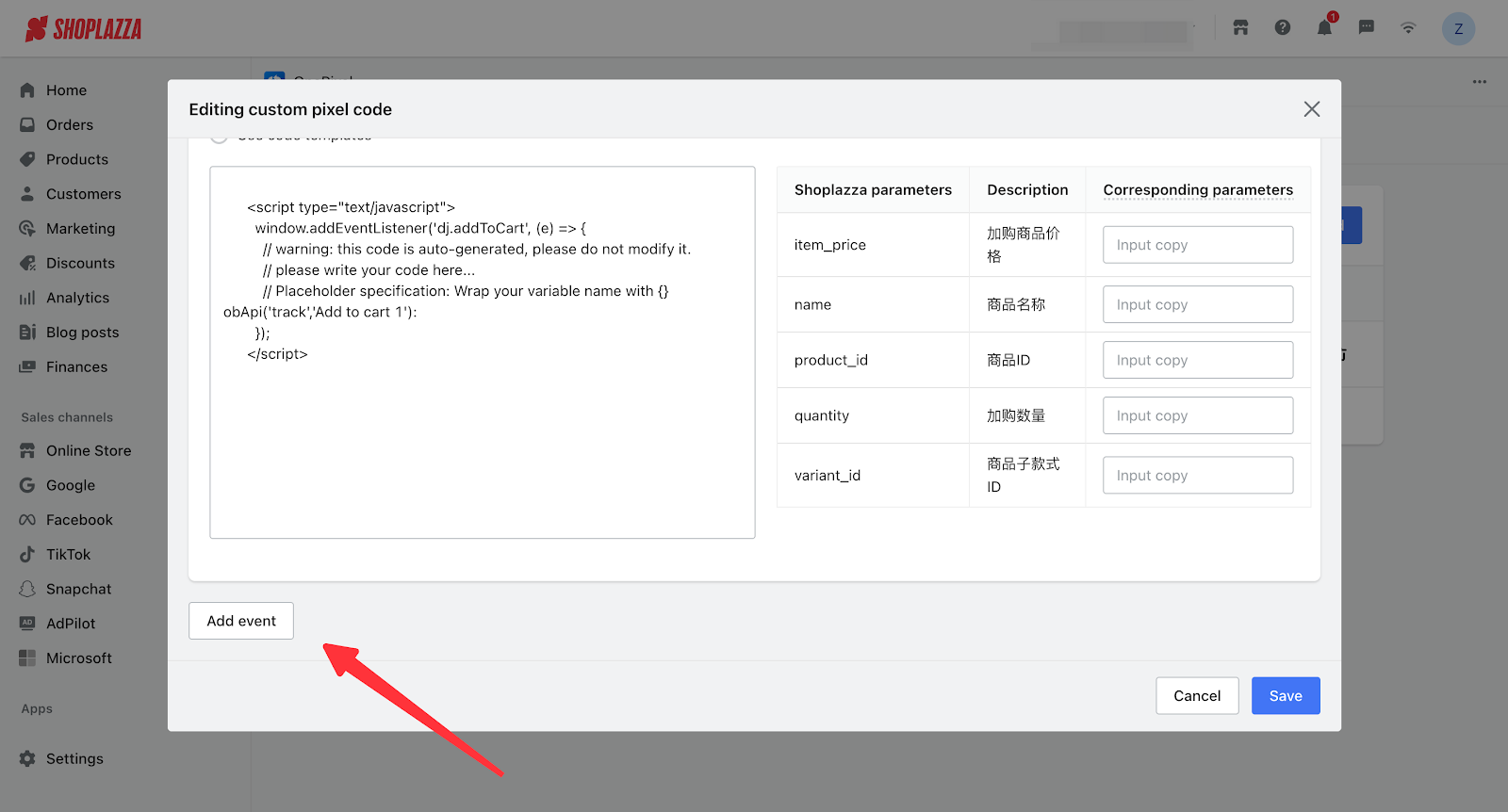 3. Go to the Shoplazza admin > Apps > One Pixel. Select Custom Pixel Code and click the Add button.