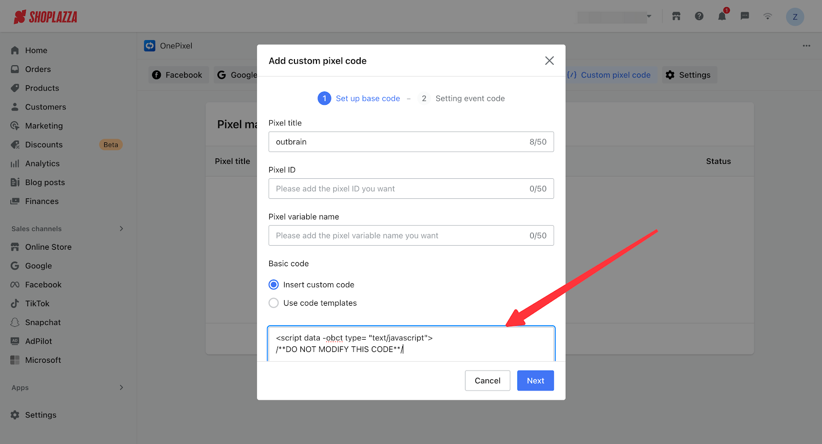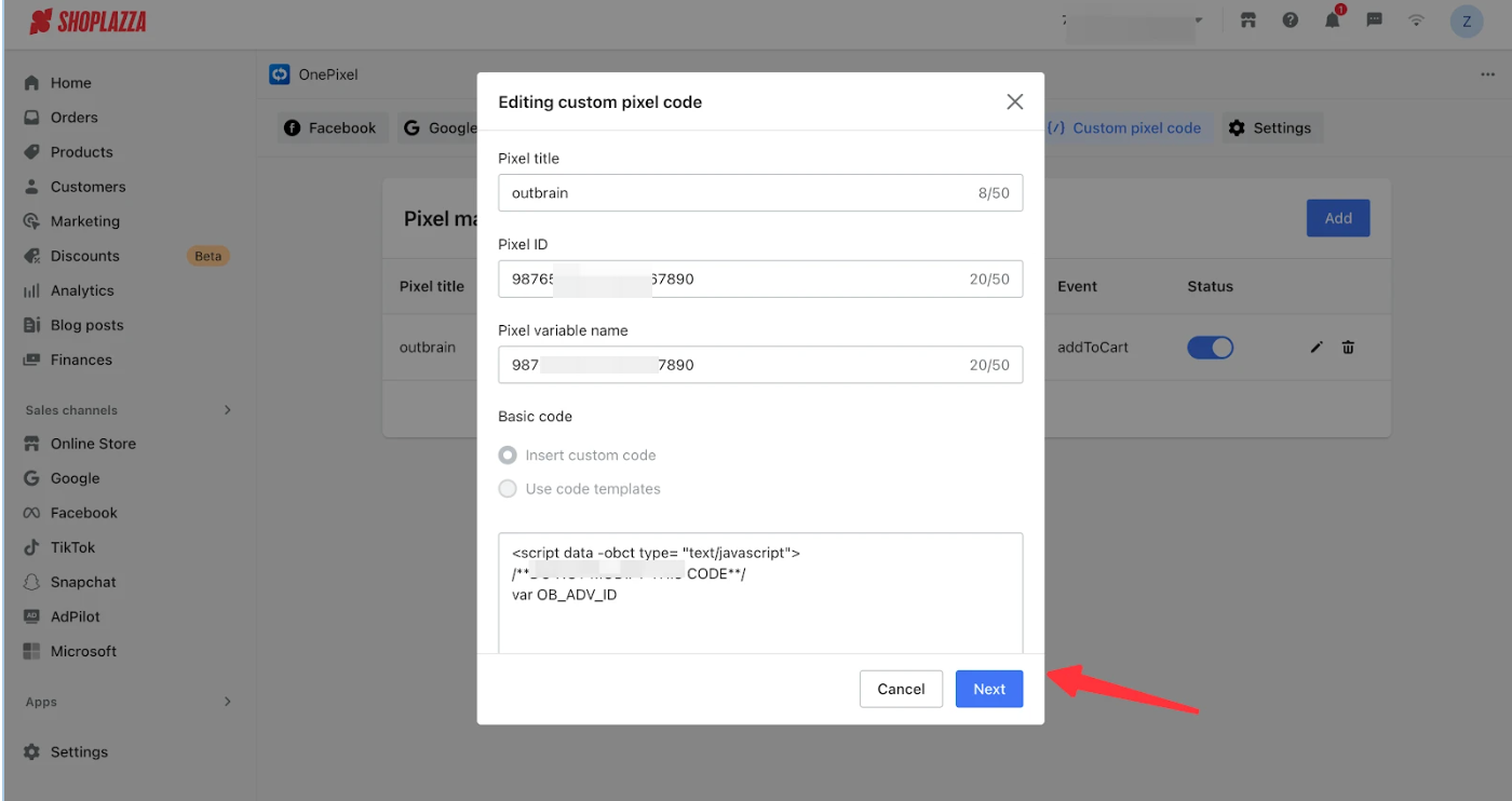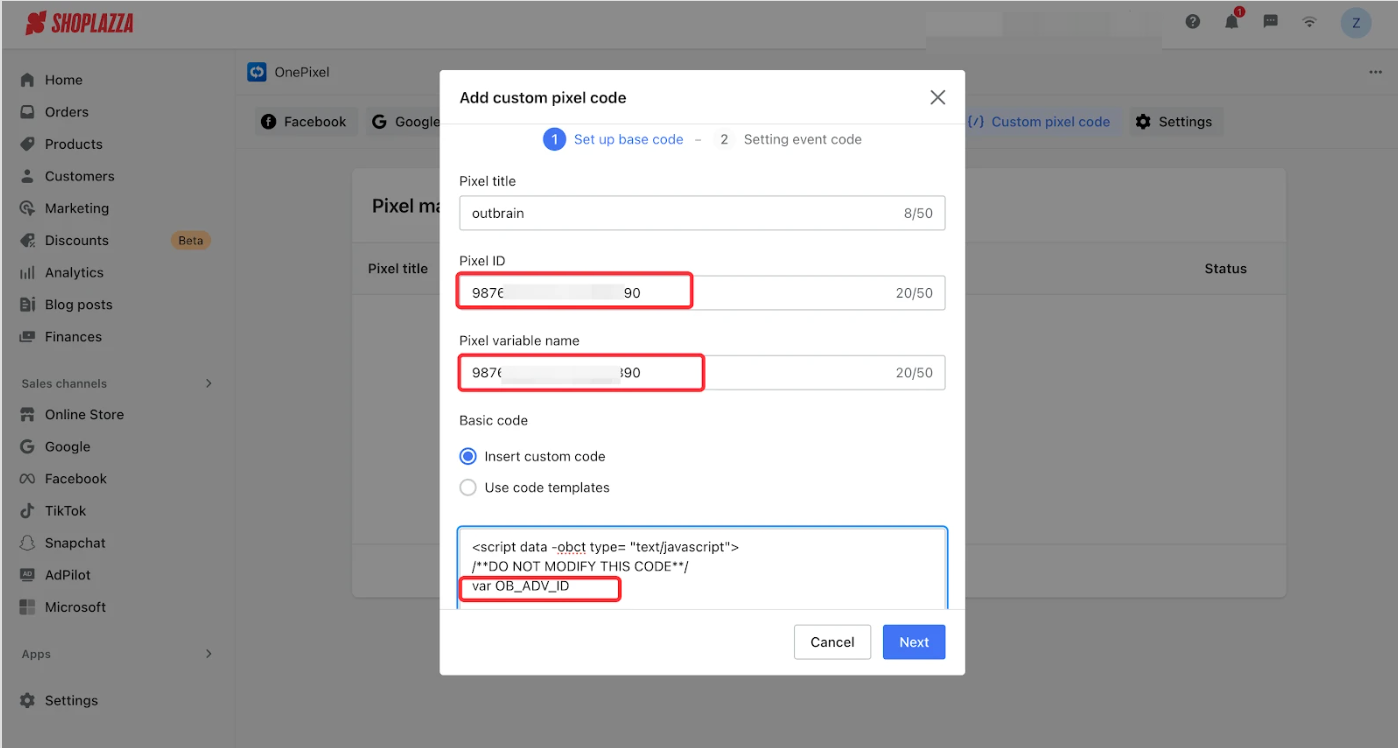 4. Paste the code into the input box. Copy the ID following var OB_ADV_ID in the code and enter it into both the Pixel ID and Pixel Variable Name fields. Click the "Next" button and keep this page open.