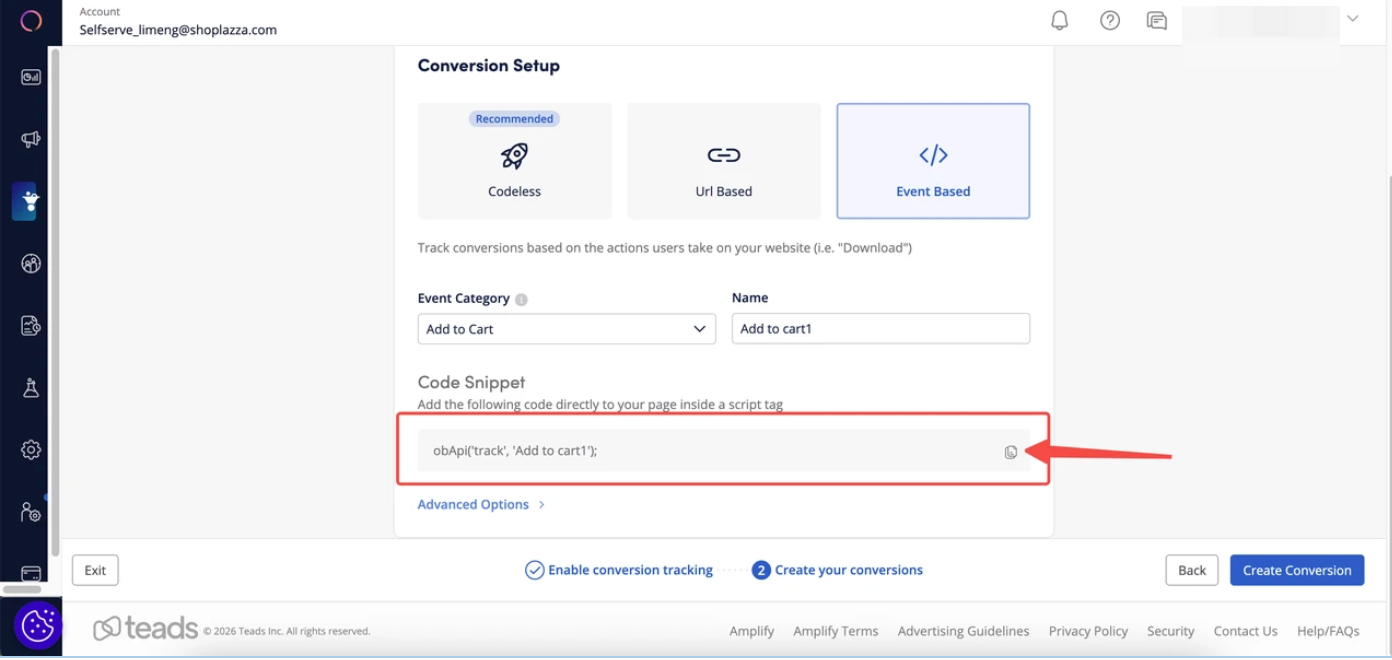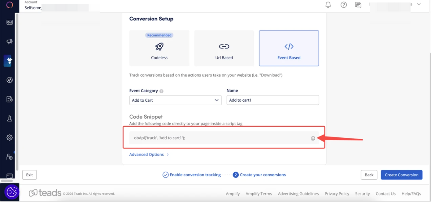 6. Select the "Event Based" type, and choose the conversion event you want to add in the Event Category field.